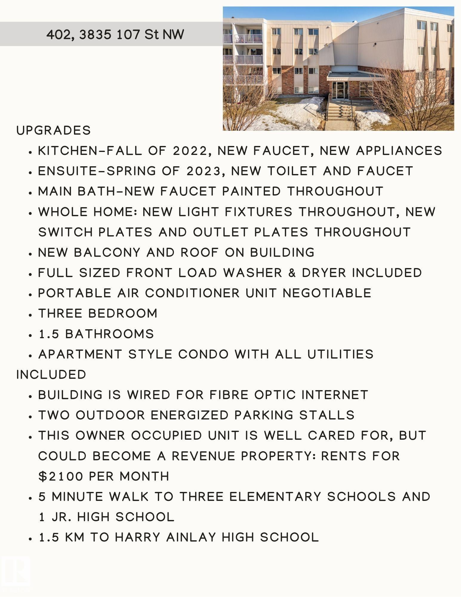 Fantastic 3 bed TOP FLOOR (private/quiet) w/IN-SUITE LAUNDRY: LG front-load washer/dryer. 2 PARKING STALLS (outdoor energized #'s 13 & 14). CONDO FEES $803.00/month ARE ALL INCLUSIVE: heat, electricity, water, snow removal, landscaping, and contributions to Reserve Fund. 10 blocks from Southgate/LRT (Century Park). Ideal rental property; rent 2 bedrooms out to cover your costs & live in the 3rd for free. In June 2017 RENO's THROUGHOUT ALL COMMON AREAS of the building included: new carpeting, baseboards, paint, light fixtures, fire doors, lobby. Newer power line to complex. Building is wired for Fibre optic internet. Whole home has been renovated, new fixtures throughout. Large West-facing deck. Master has 2 separate closets and ensuite washroom. Large storage room in suite. Cats allowed, but no dogs. Taxes 2025 $1,353.56.