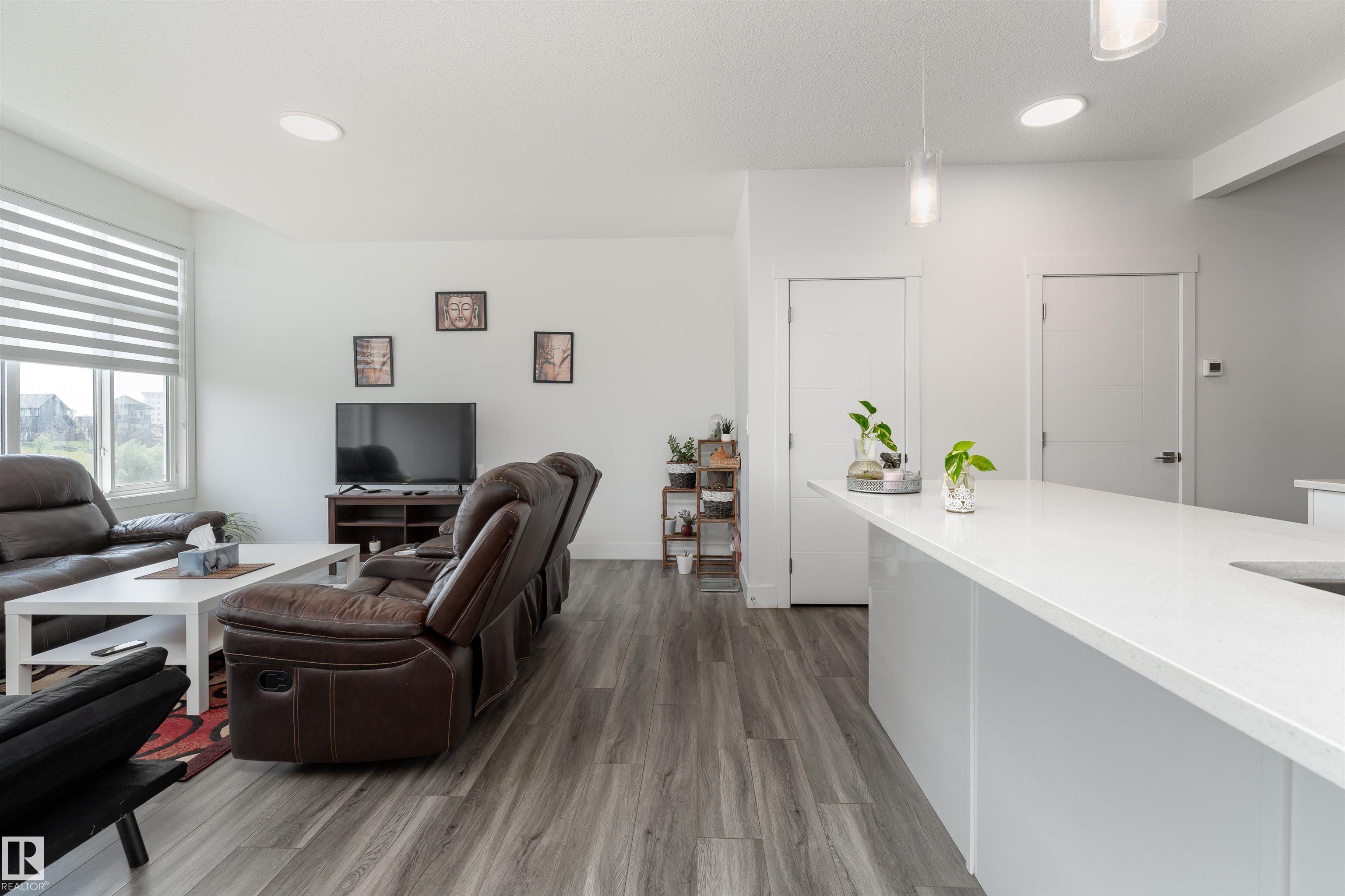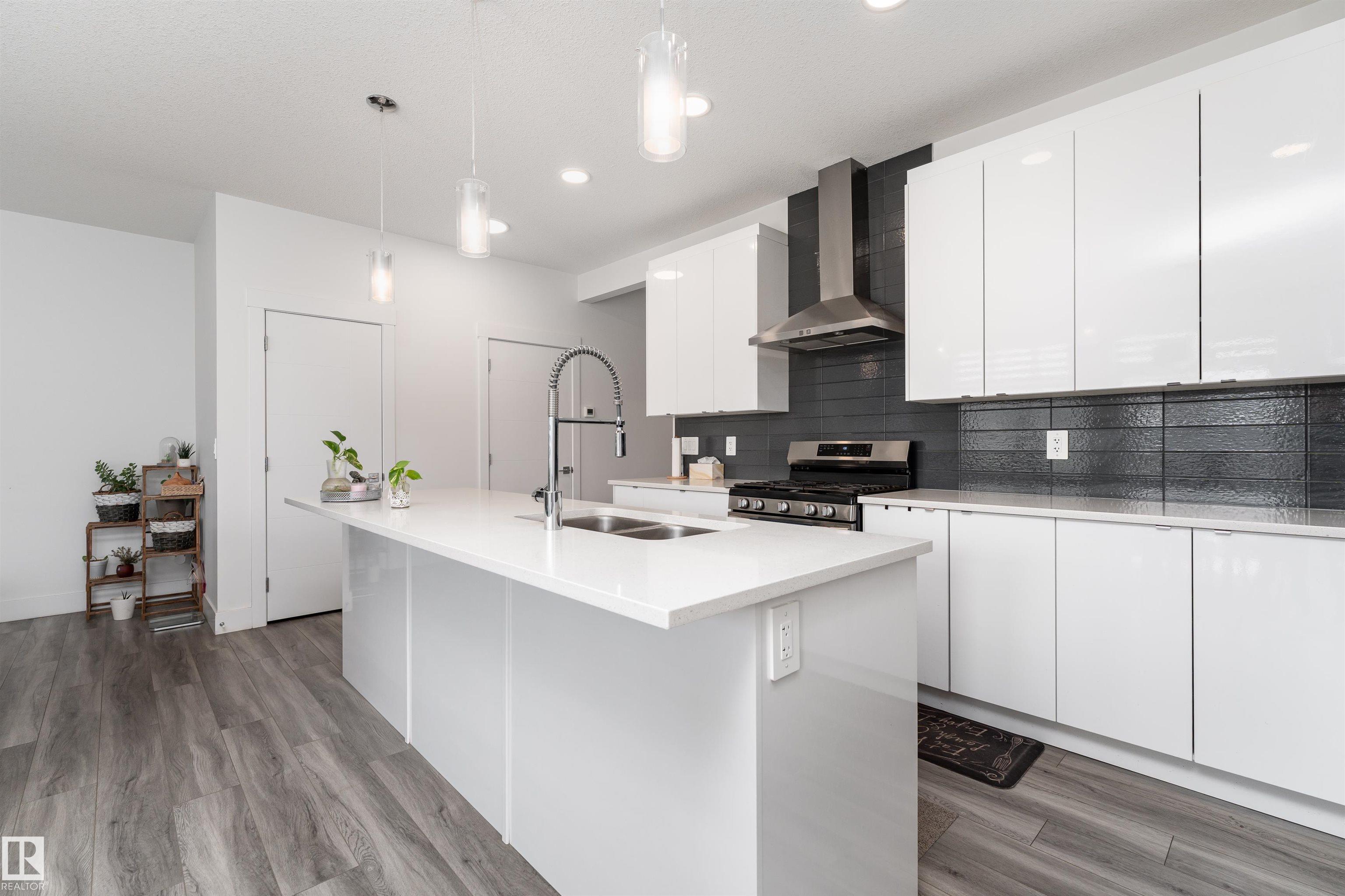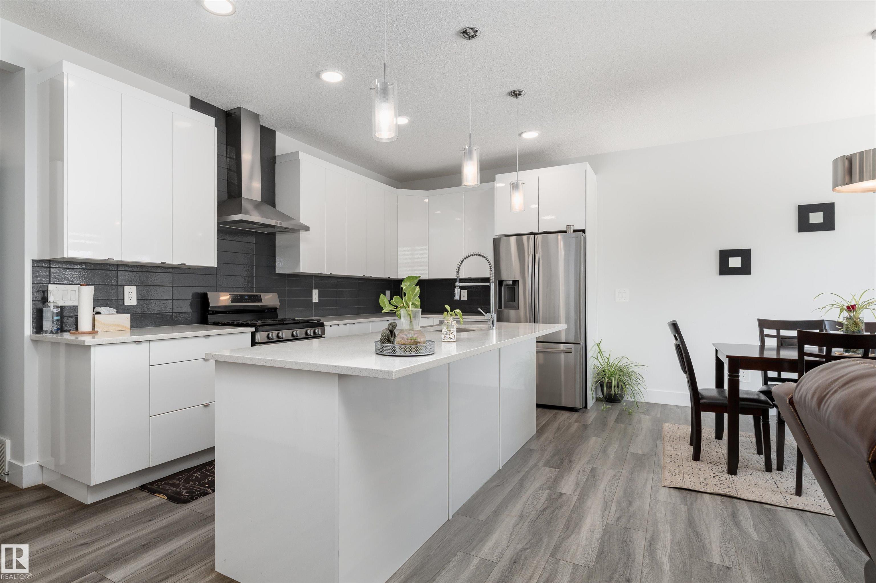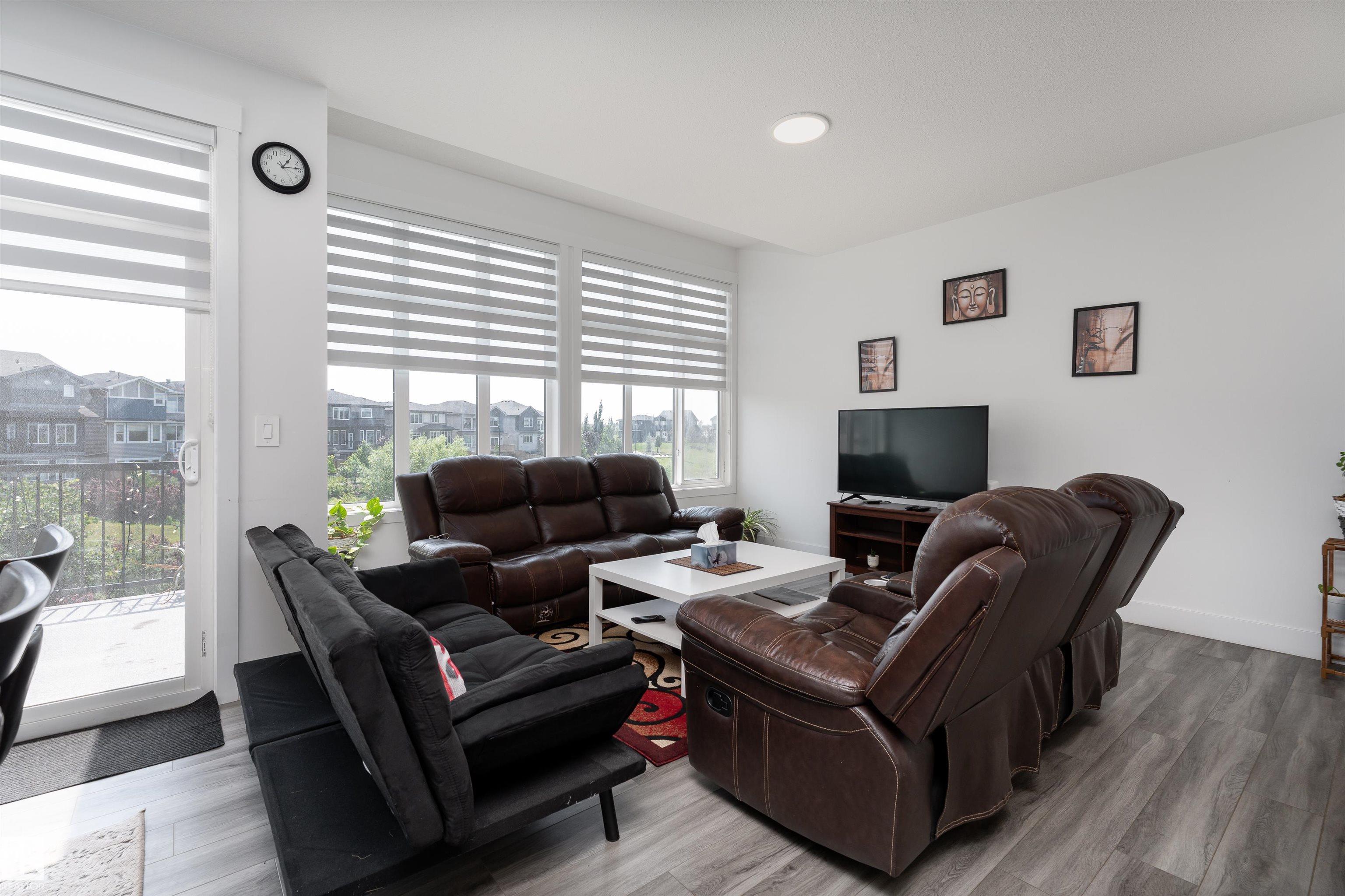 Welcome to this modern 2-storey home with a WALKOUT BASEMENT BACKING POND AND GREEN SPACE in the community of CAVANAGH!! The main floor with 9" CEILING is filled with natural light, thanks to large windows with CUSTOM BLINDS in the spacious living and dining areas. The dining room offers direct access to the balcony, perfect for relaxing or entertaining. The contemporary kitchen features sleek 42" WHITE CABINETRY, ample counter space, a central island, stainless steel appliances with a GAS RANGE and CHIMNEY STACK, QUARTZ COUNTERTOPS throughout and a WALK-IN PANTRY. A convenient BEDROOM AND a FULL BATHROOM completes the main level. Upstairs, the primary bedroom boasts expansive windows with a neighborhood view with a luxurious 5-piece ensuite and a walk-in closet, a cozy bonus room, upper-level laundry, two additional bedrooms and a 3-piece bathroom. Enjoy outdoor living in the FULLY LANDSCAPED YARD and convenience of DOUBLE ATTACHED GARAGE. Stylish, functional, and move-in ready?this home is a must-see!