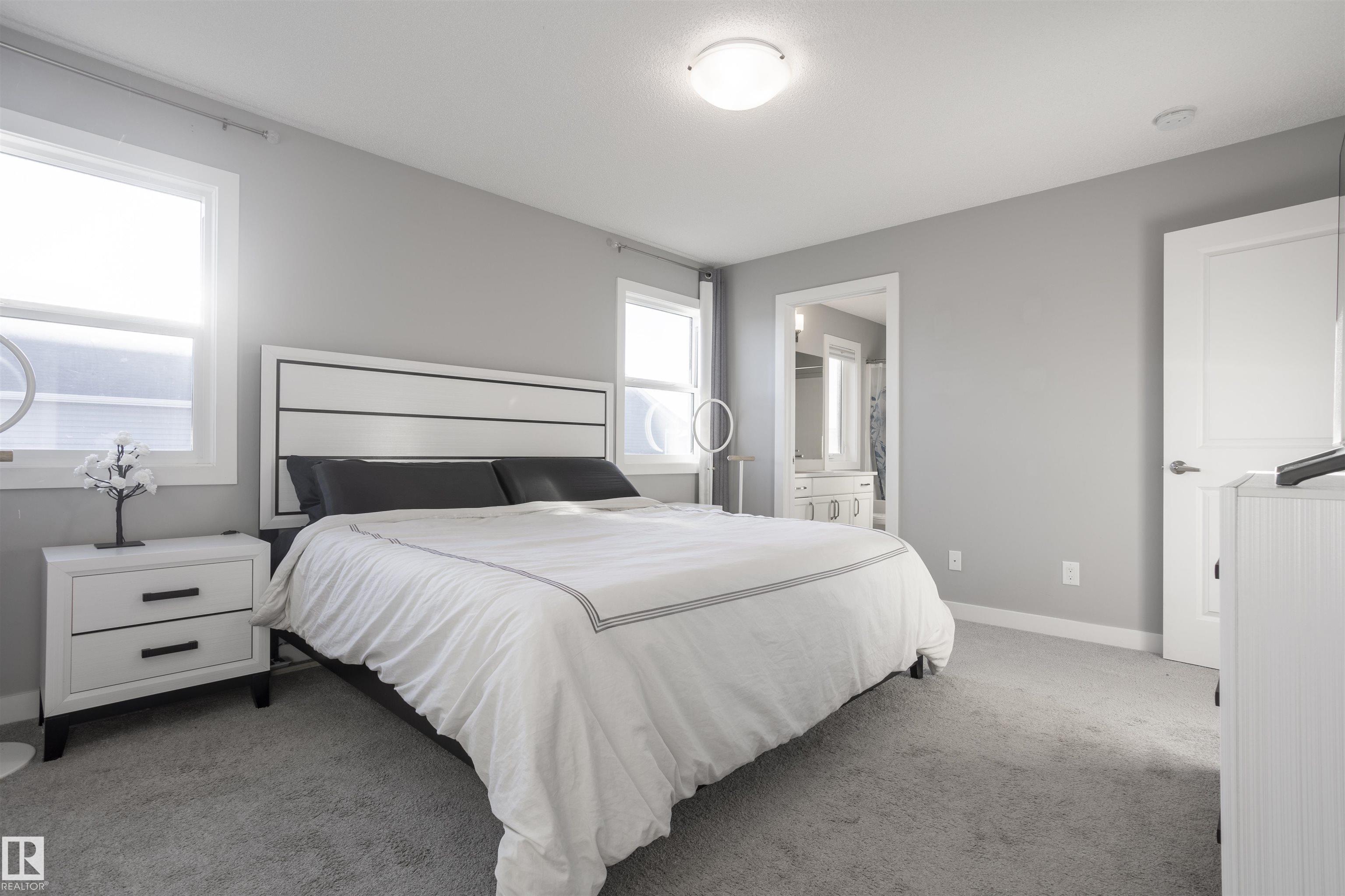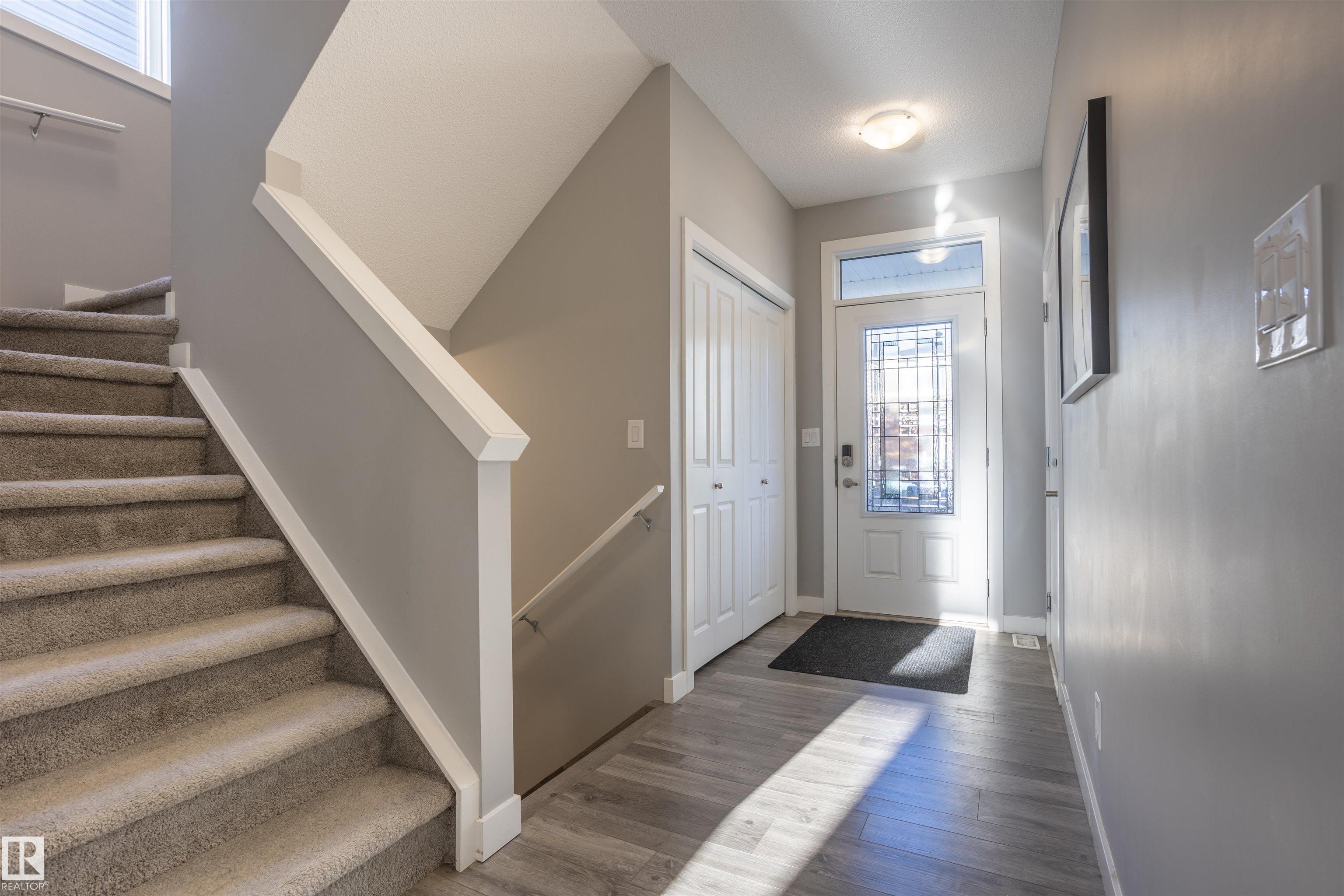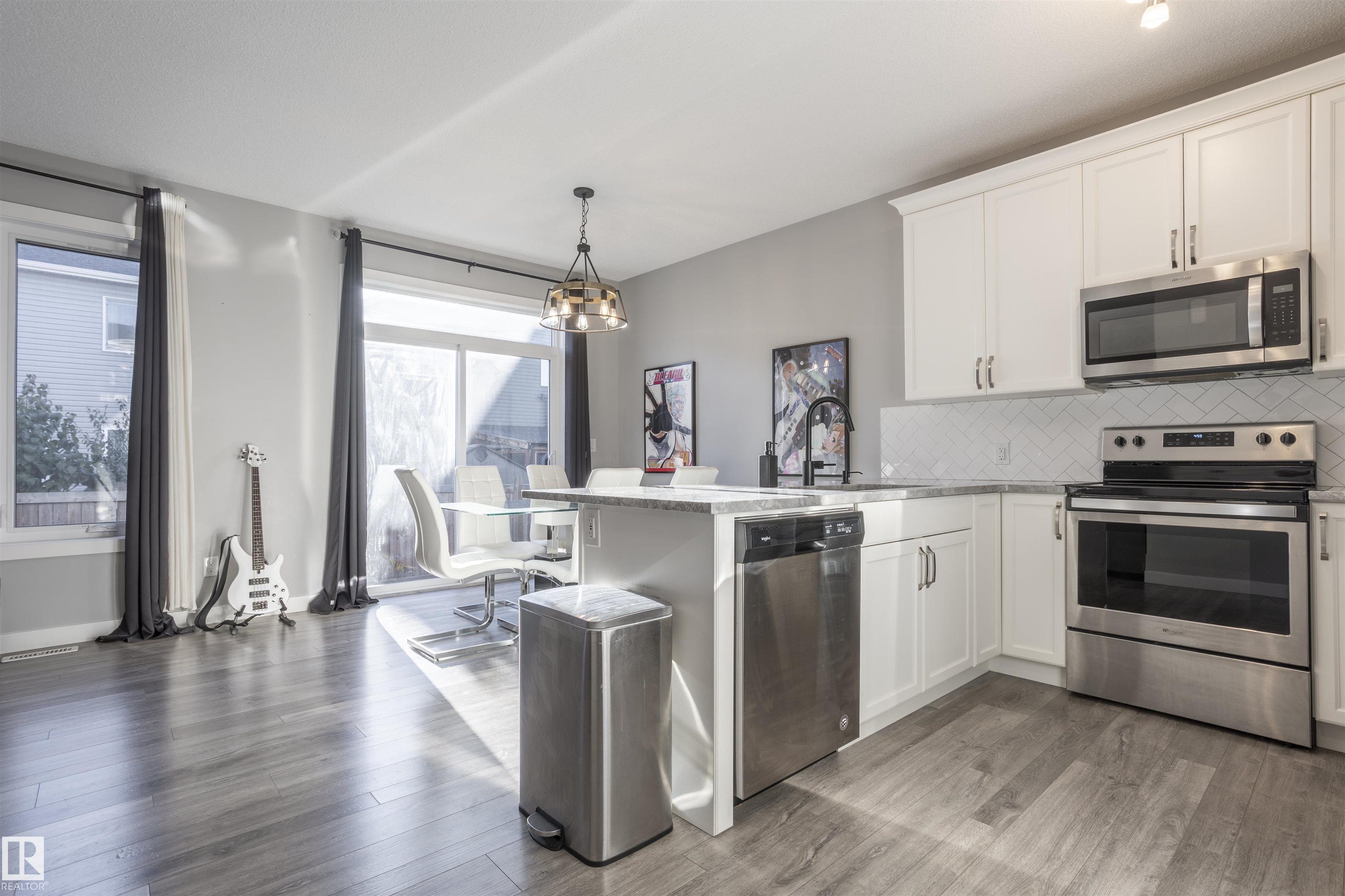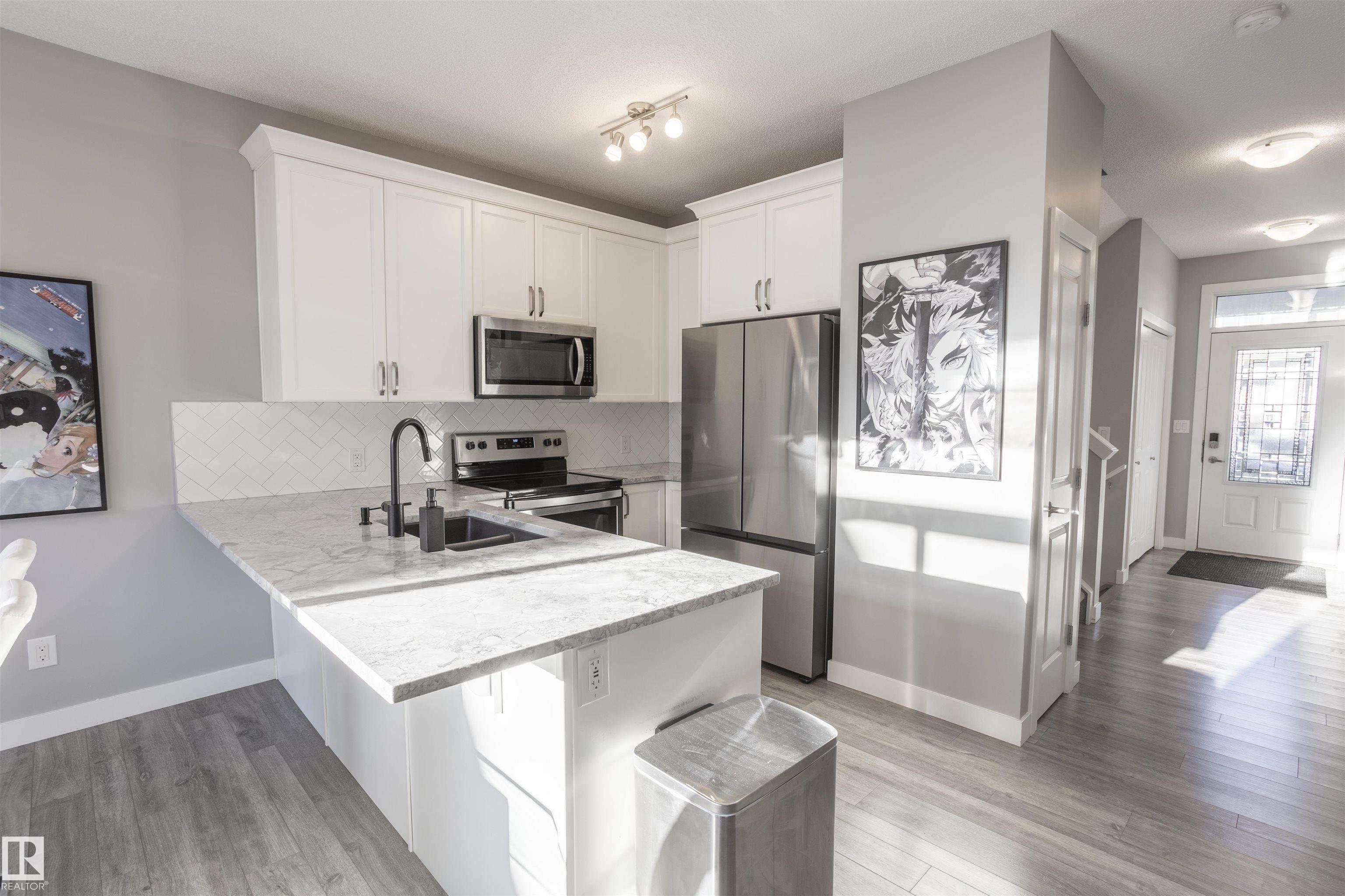 Step inside this stunning, air conditioned, low maintenance landscaped, 3-bedroom, 2.5-bath home and prepare to be impressed. Bright, welcoming, and beautifully finished, it offers a perfect mix of modern style and everyday comfort. The main floor showcases soaring 9-foot ceilings, luxury vinyl plank flooring, and a designer kitchen complete with quartz countertops and a gorgeous herringbone backsplash. The open layout flows seamlessly for entertaining or family time, and the fully fenced backyard is ideal for kids and pets. Upstairs, a large main bath with a private water closet complements two generous bedrooms and an expansive primary suite featuring a walk-in closet and elegant ensuite with quartz finishes. Convenient upstairs laundry adds practicality to busy days, while the unfinished basement is ready for your ideas. Nestled on a quiet street, this home is just steps from a private playground, spray park, skating rink, and scenic walking trails. Stylish, functional, and move-in ready
