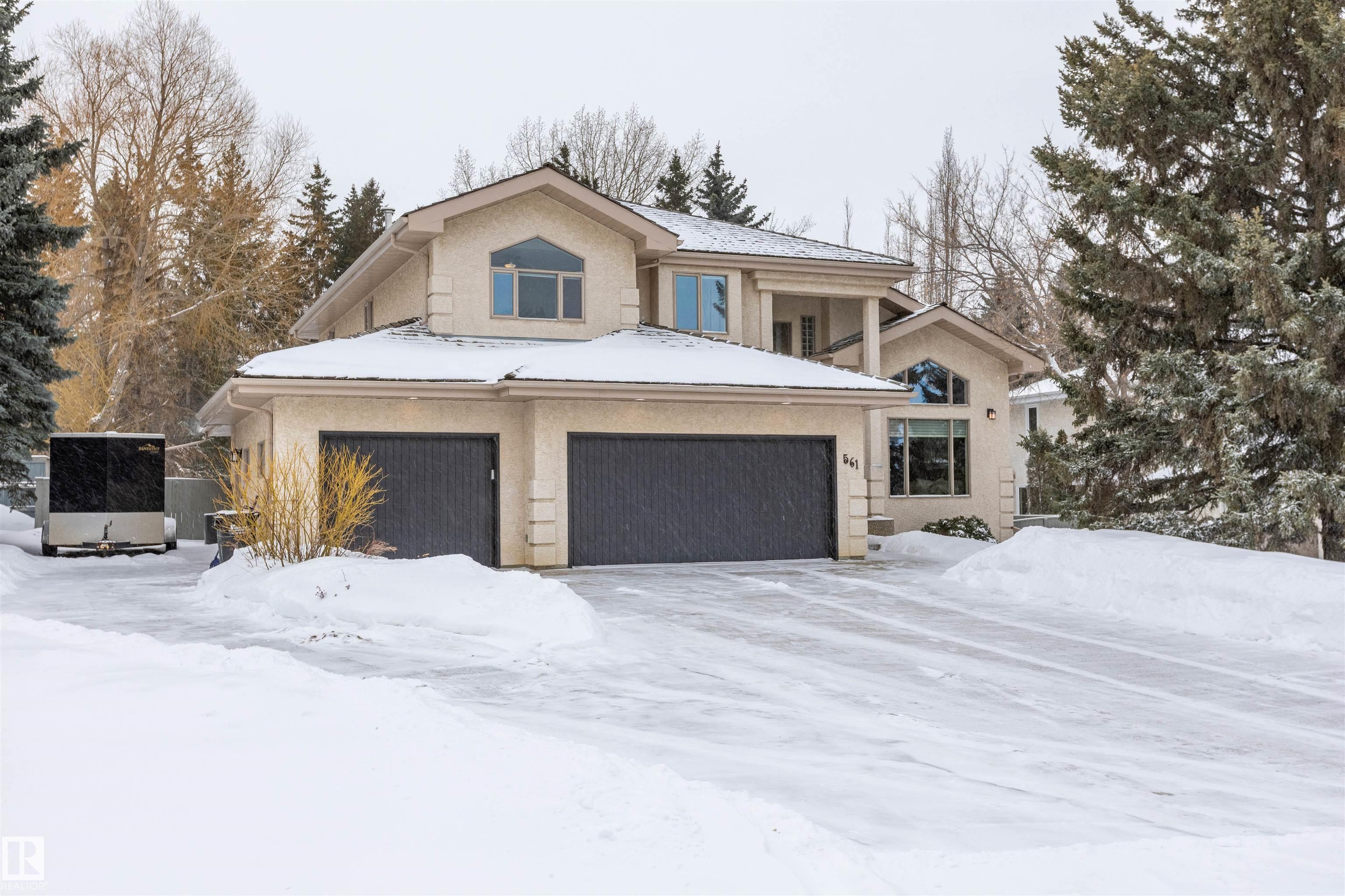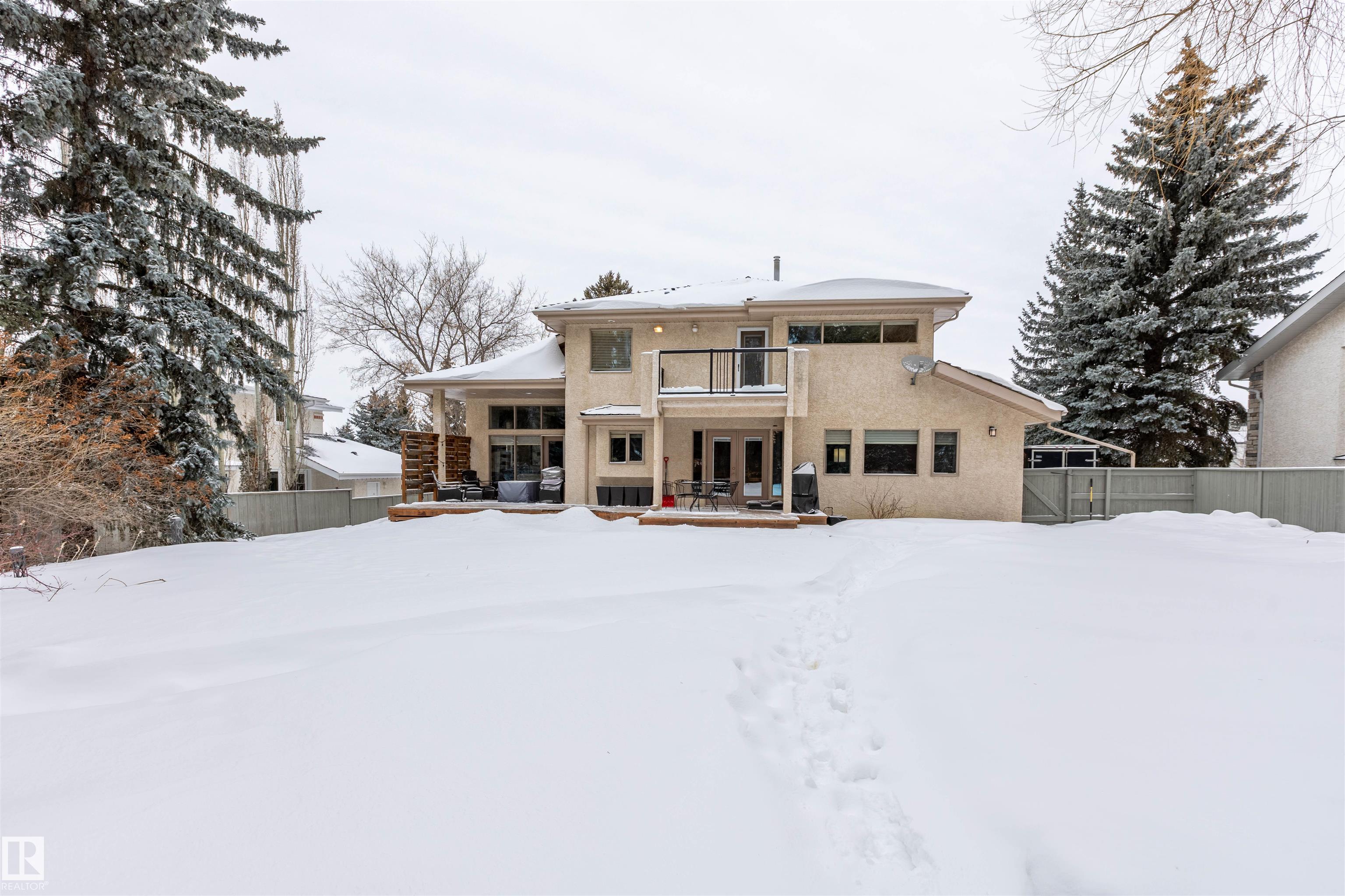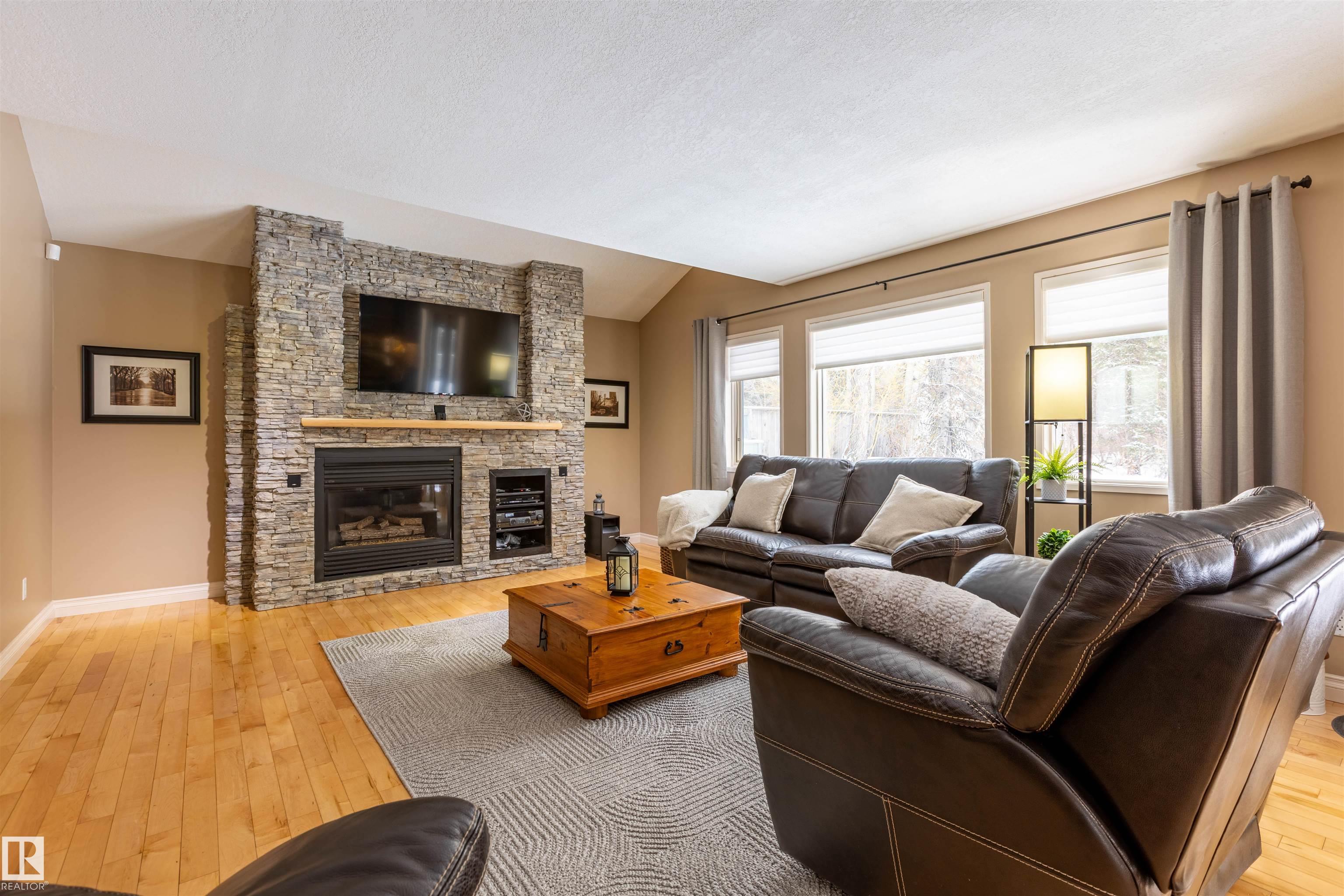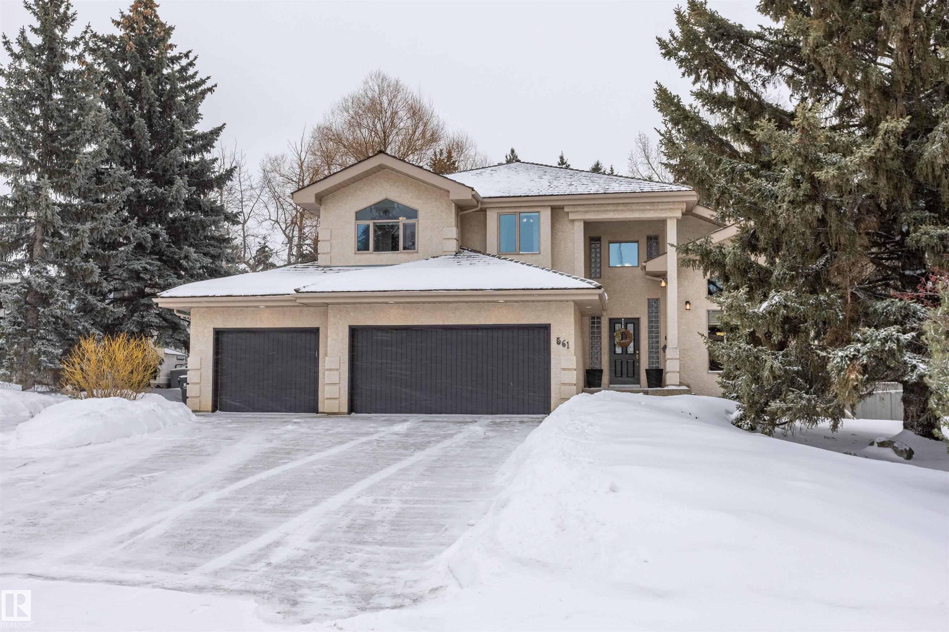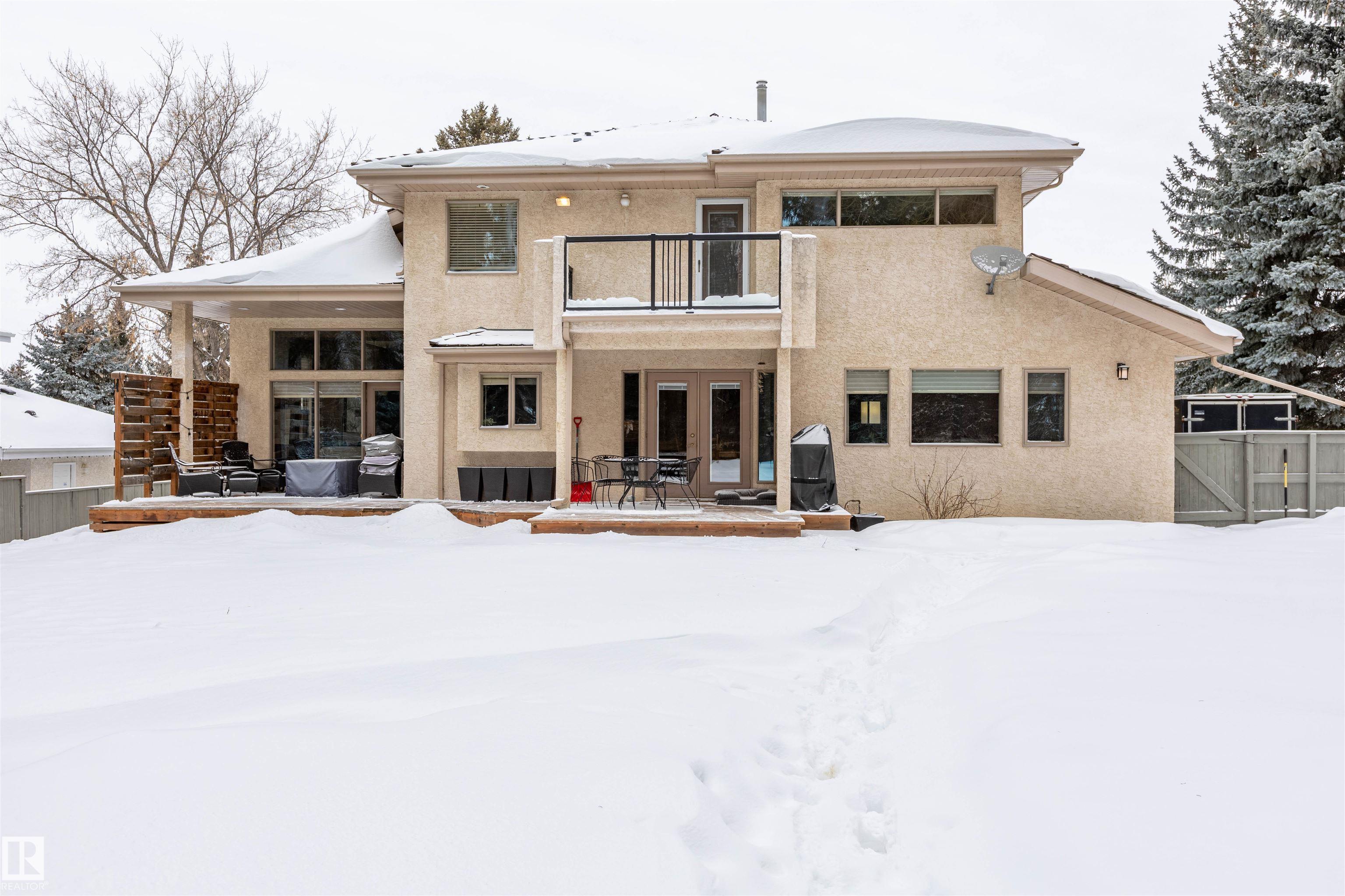 Welcome to the prestigious Estates of Sherwood Park! Tucked away on a quiet, private lot surrounded by mature trees, this beautiful 2700+ SqFt, 5 bed, 4 bath home features a heated triple attached garage, RV parking, 220V wiring, Central A/C, and an unbeatable location. A grand foyer leads to the bright family room and formal dining area before opening to a spacious kitchen and inviting living room with built-in sound system, perfect for entertaining. The main floor also features a large office and mudroom off the garage. Upstairs offers a massive primary retreat with a private south-facing balcony overlooking the backyard, a luxurious 6-pc ensuite with heated floors, two walk-in closets, two additional bedrooms, and convenient upstairs laundry. The fully finished basement includes a large recreation room with built-in speakers and projector, two bedrooms, and a 3-pc bath. Enjoy the sunny south-facing backyard with mature trees, full fencing, landscaping, and a large deck. Some photos contain AI staging.