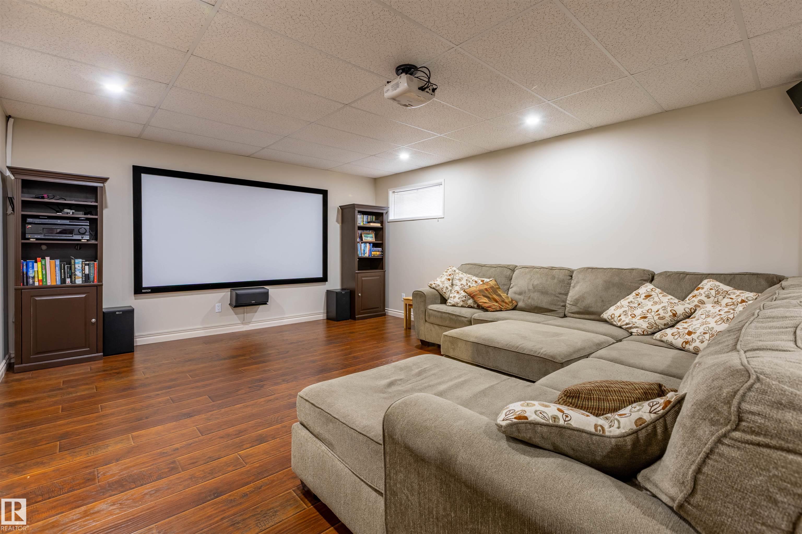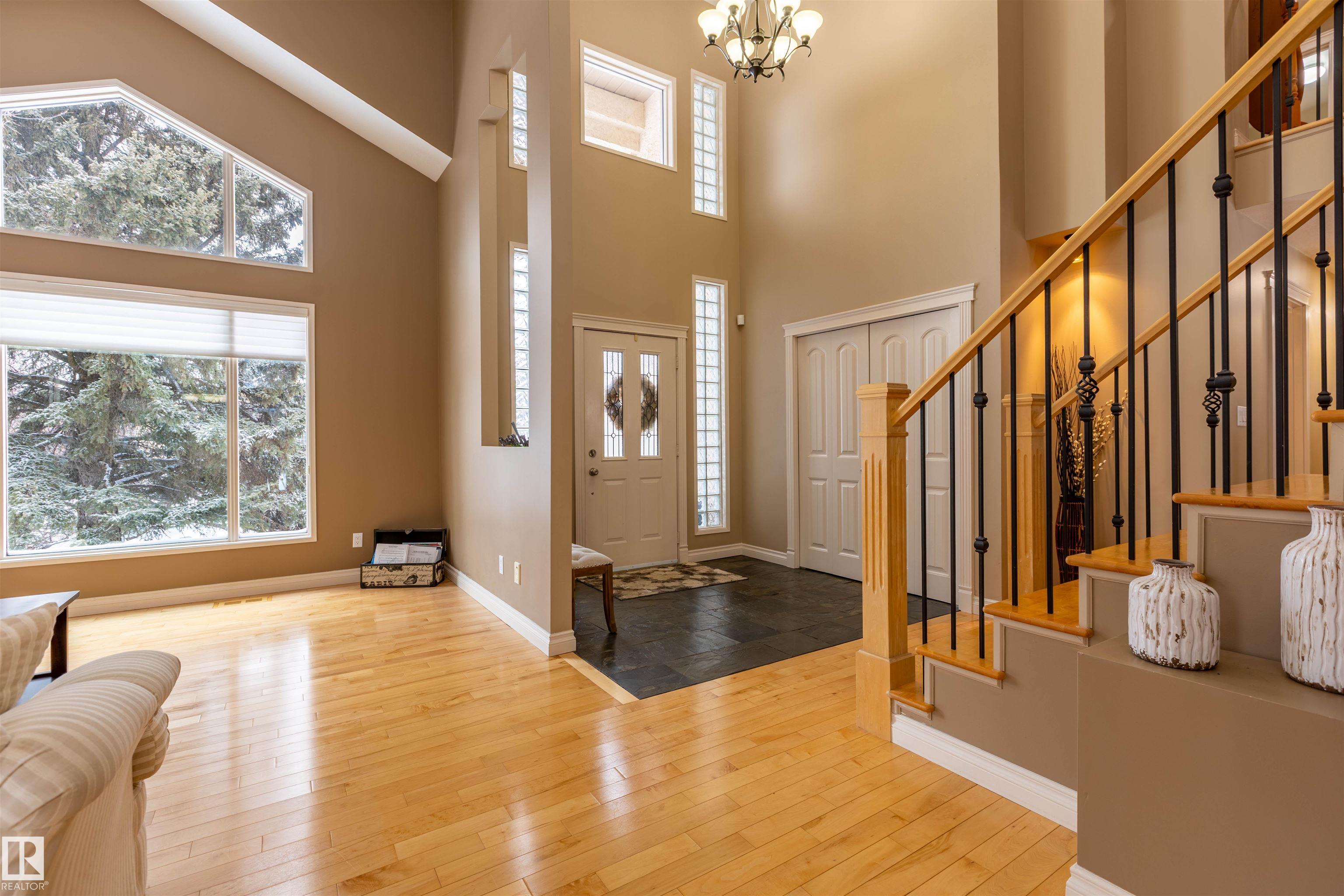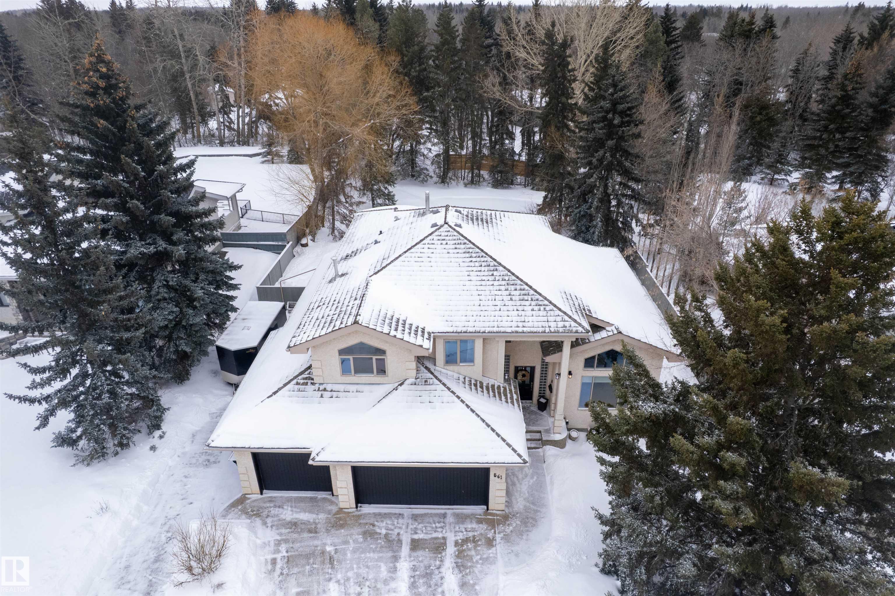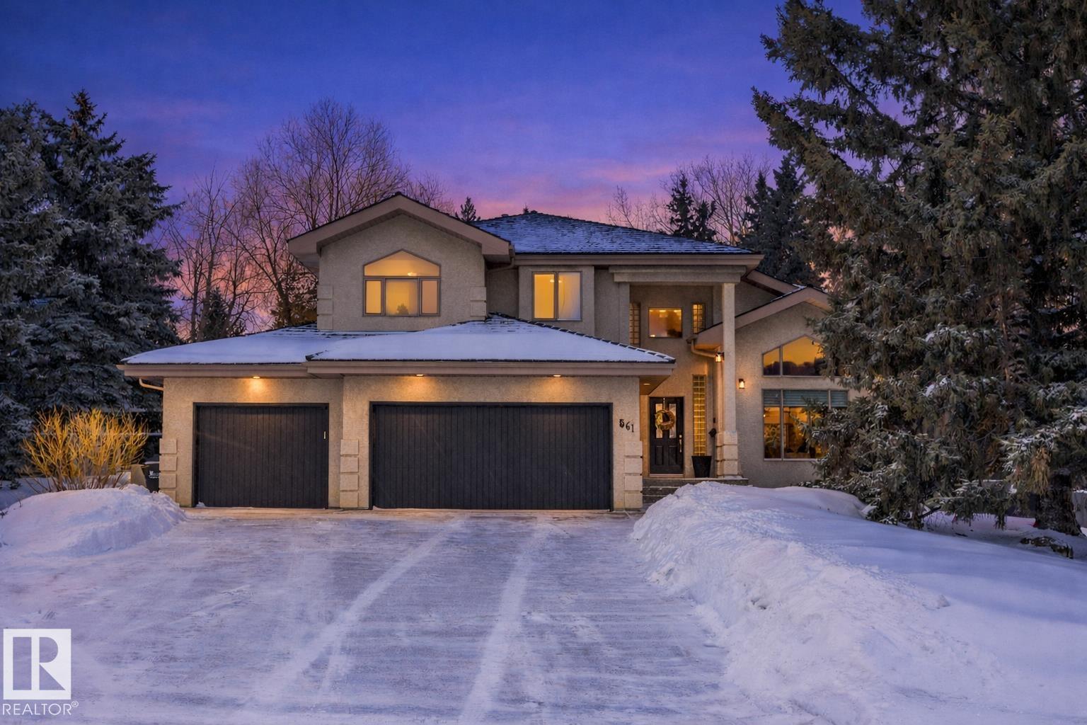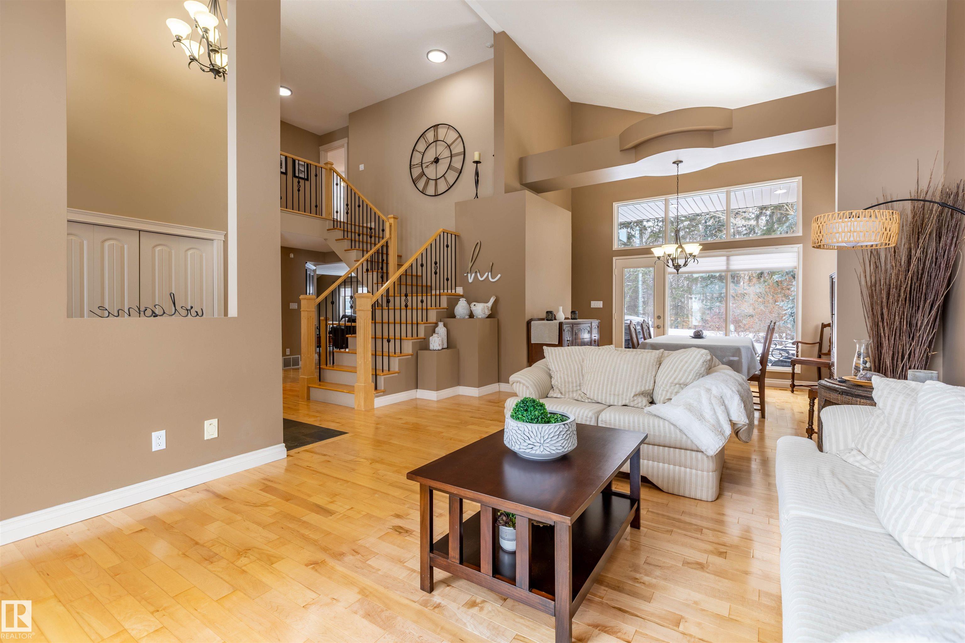 Welcome to the prestigious Estates of Sherwood Park! Tucked away on a quiet, private lot surrounded by mature trees, this beautiful 2700+ SqFt, 5 bed, 4 bath home features a heated triple attached garage, RV parking, 220V wiring, Central A/C, and an unbeatable location. A grand foyer leads to the bright family room and formal dining area before opening to a spacious kitchen and inviting living room with built-in sound system, perfect for entertaining. The main floor also features a large office and mudroom off the garage. Upstairs offers a massive primary retreat with a private south-facing balcony overlooking the backyard, a luxurious 6-pc ensuite with heated floors, two walk-in closets, two additional bedrooms, and convenient upstairs laundry. The fully finished basement includes a large recreation room with built-in speakers and projector, two bedrooms, and a 3-pc bath. Enjoy the sunny south-facing backyard with mature trees, full fencing, landscaping, and a large deck. Some photos contain AI staging.