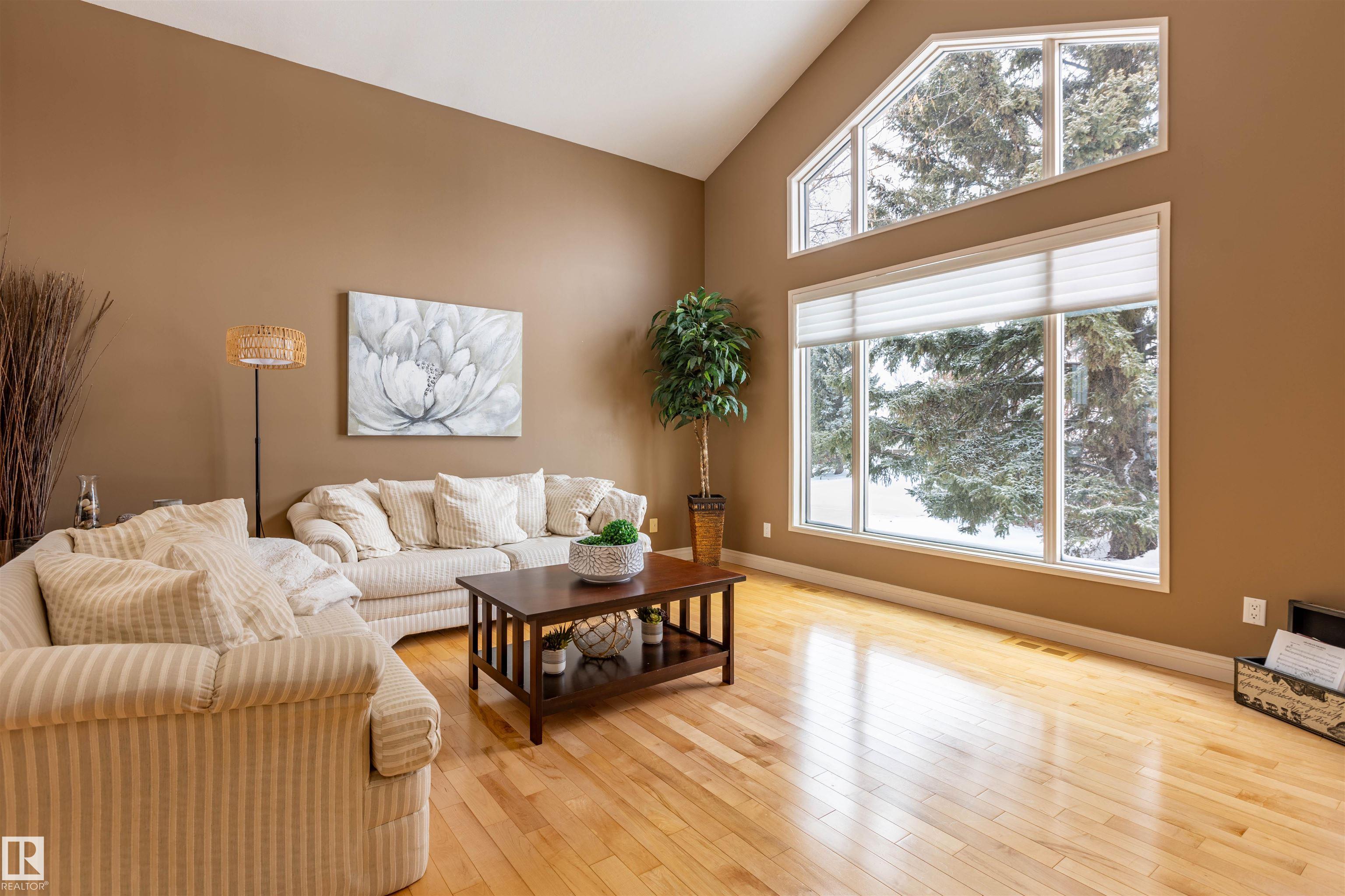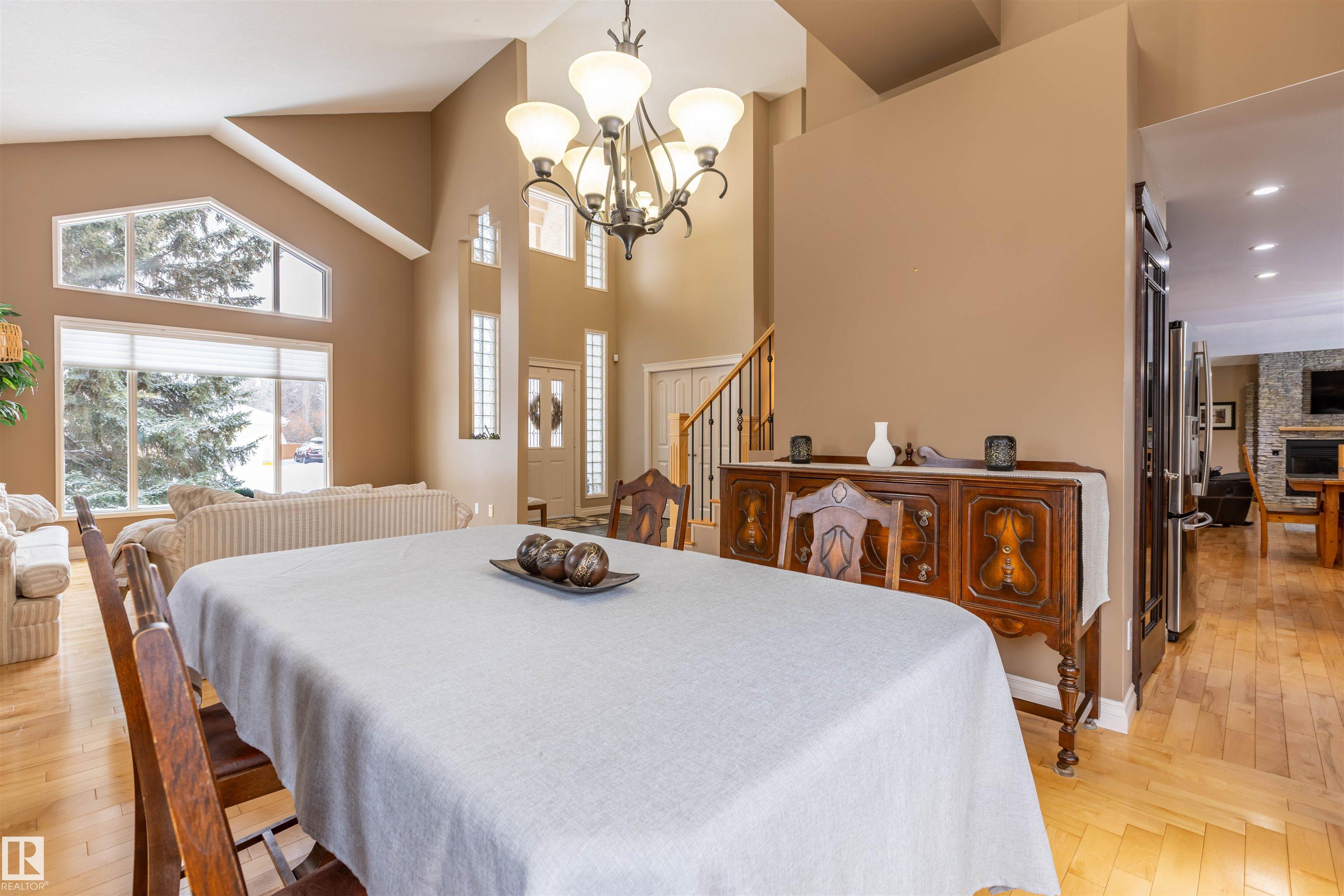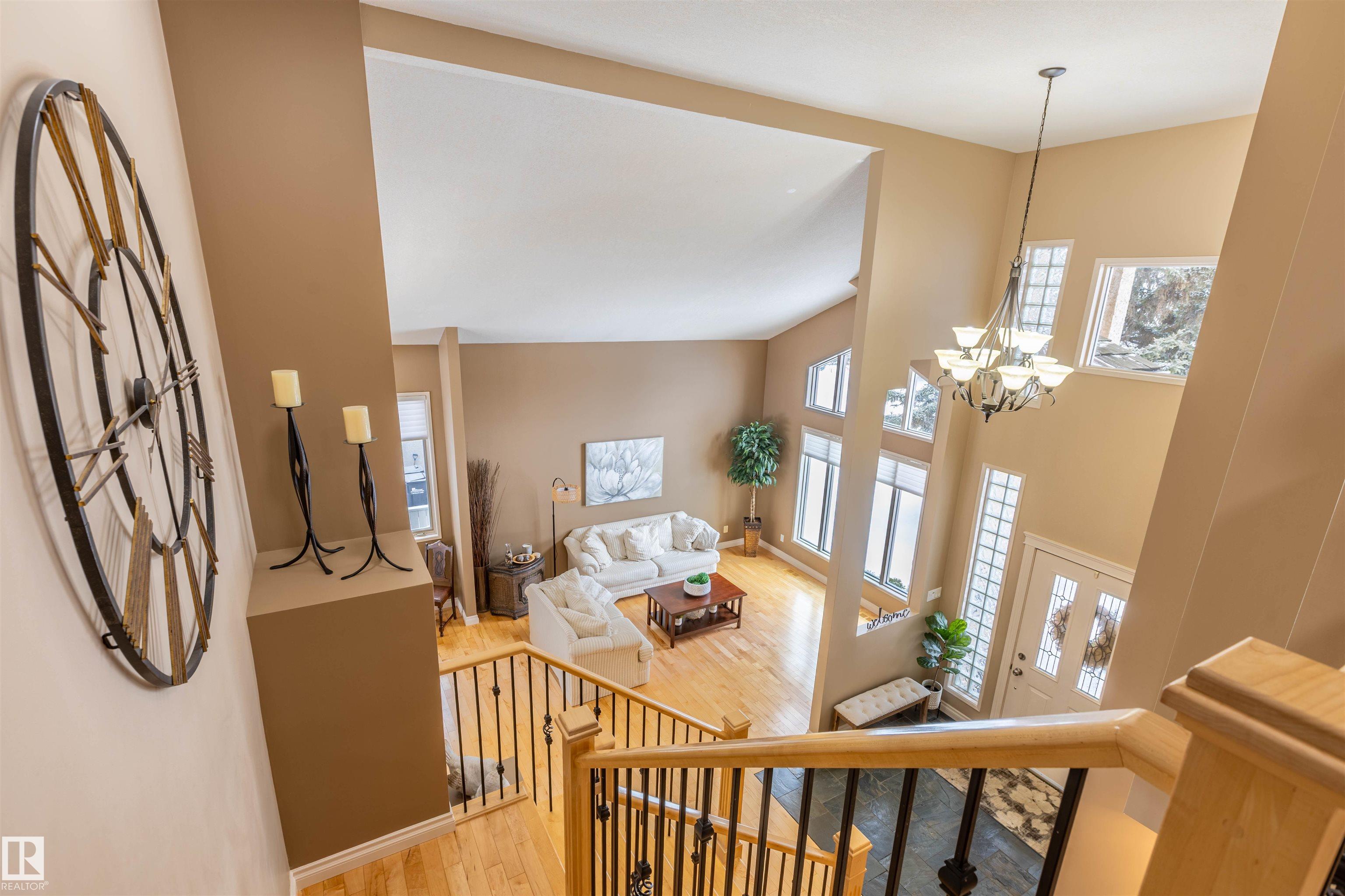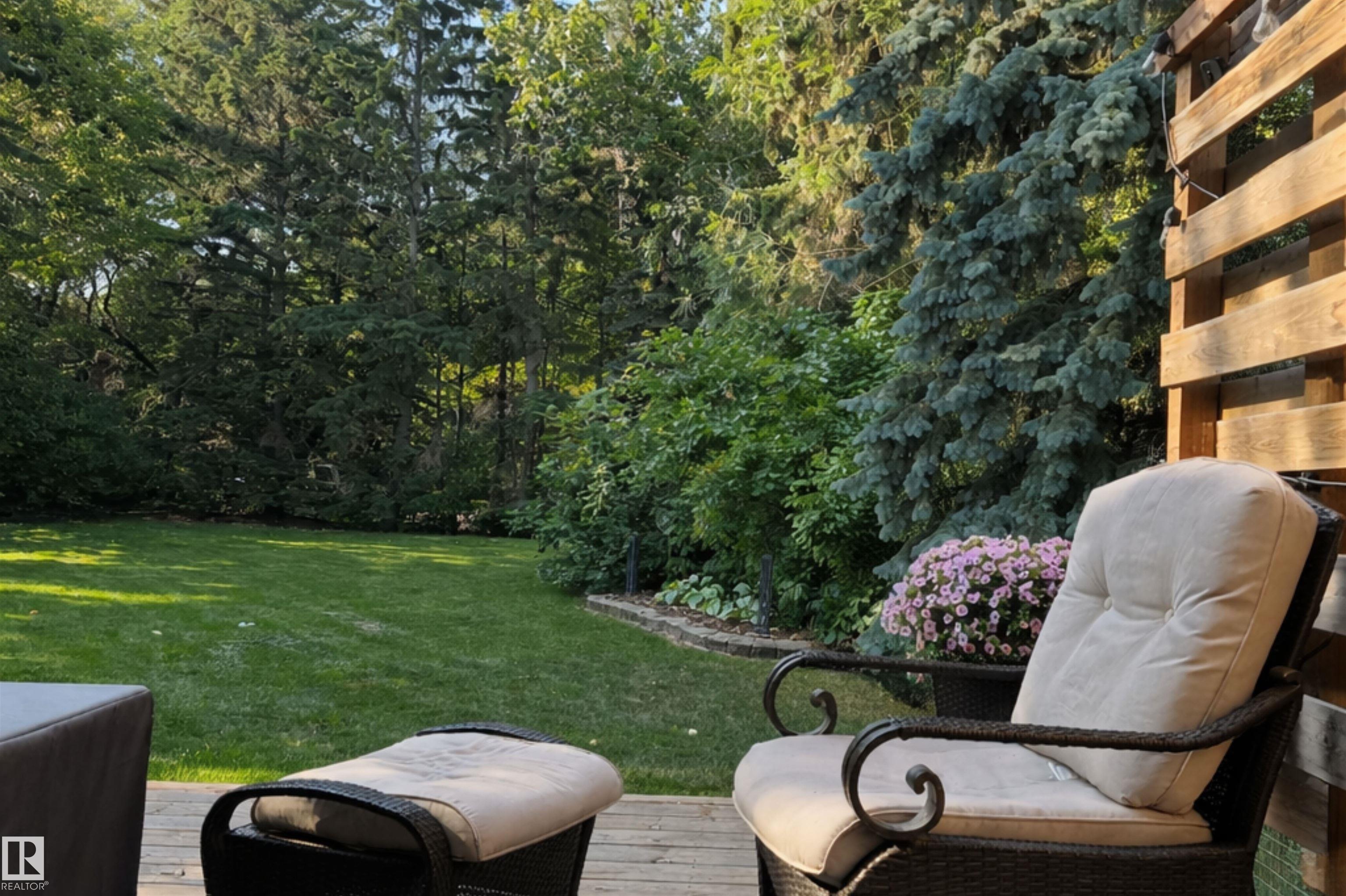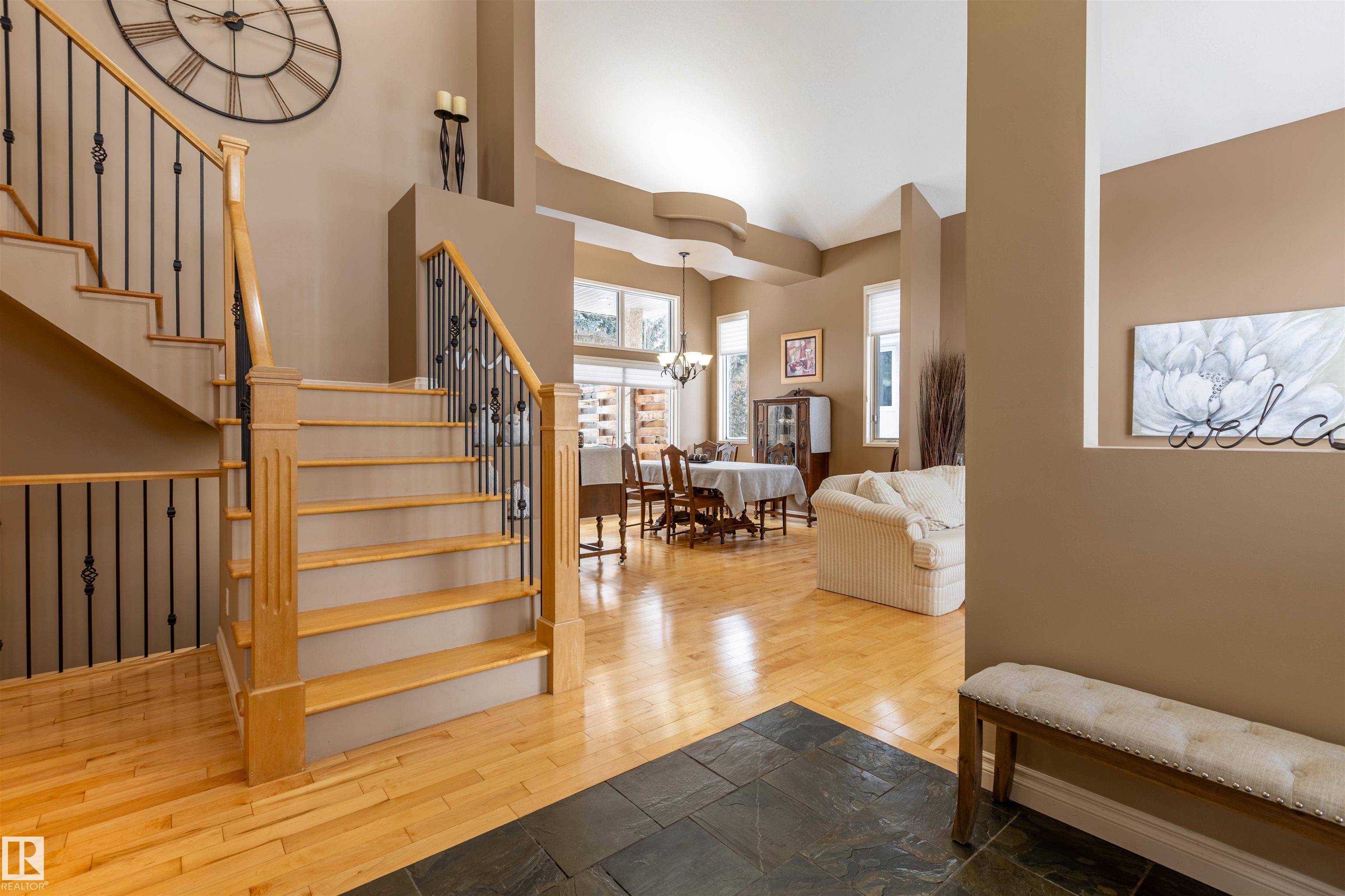 Welcome to the prestigious Estates of Sherwood Park! Tucked away on a quiet, private lot surrounded by mature trees, this beautiful 2700+ SqFt, 5 bed, 4 bath home features a heated triple attached garage, RV parking, 220V wiring, Central A/C, and an unbeatable location. A grand foyer leads to the bright family room and formal dining area before opening to a spacious kitchen and inviting living room with built-in sound system, perfect for entertaining. The main floor also features a large office and mudroom off the garage. Upstairs offers a massive primary retreat with a private south-facing balcony overlooking the backyard, a luxurious 6-pc ensuite with heated floors, two walk-in closets, two additional bedrooms, and convenient upstairs laundry. The fully finished basement includes a large recreation room with built-in speakers and projector, two bedrooms, and a 3-pc bath. Enjoy the sunny south-facing backyard with mature trees, full fencing, landscaping, and a large deck. Some photos contain AI staging.