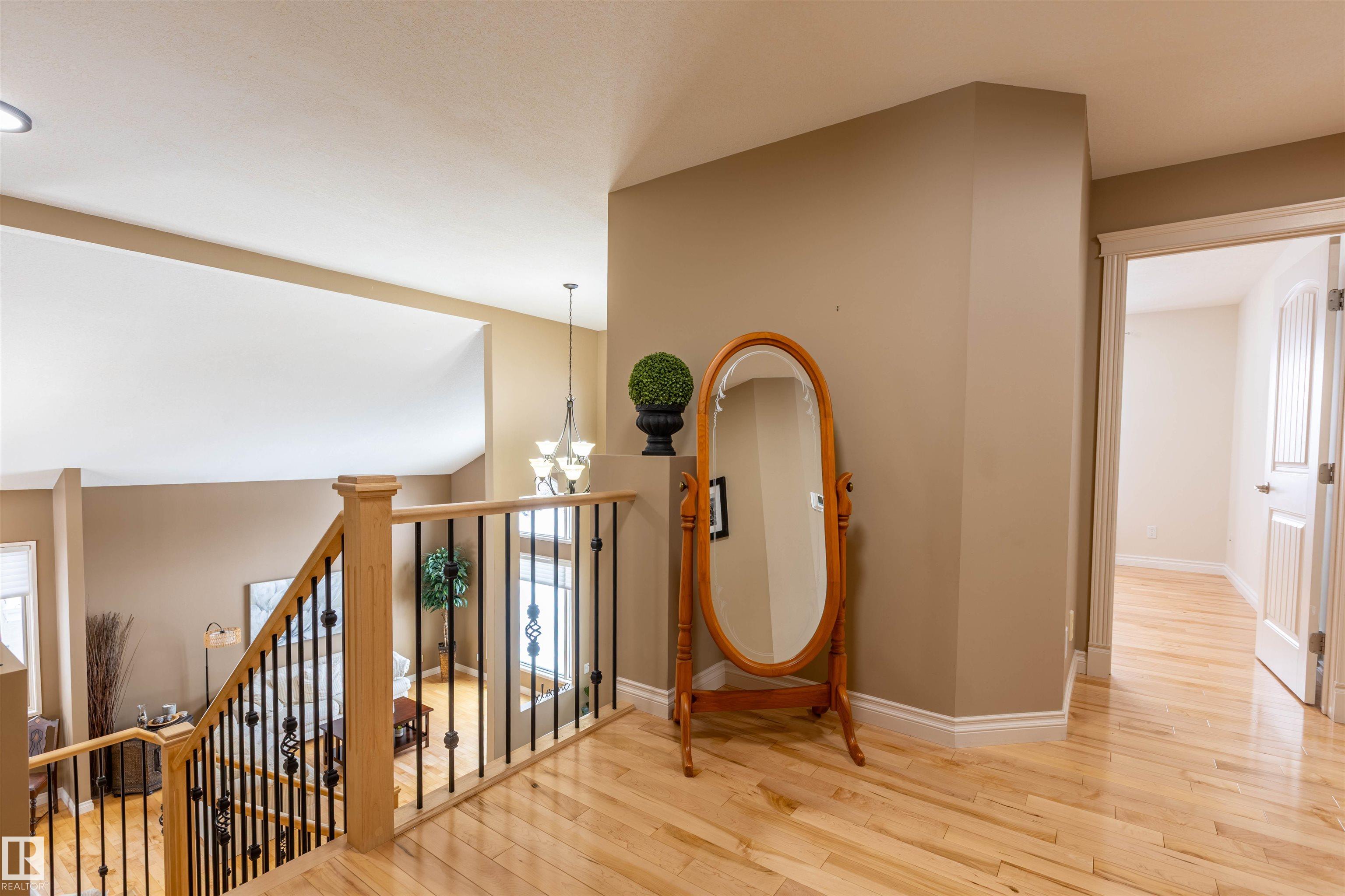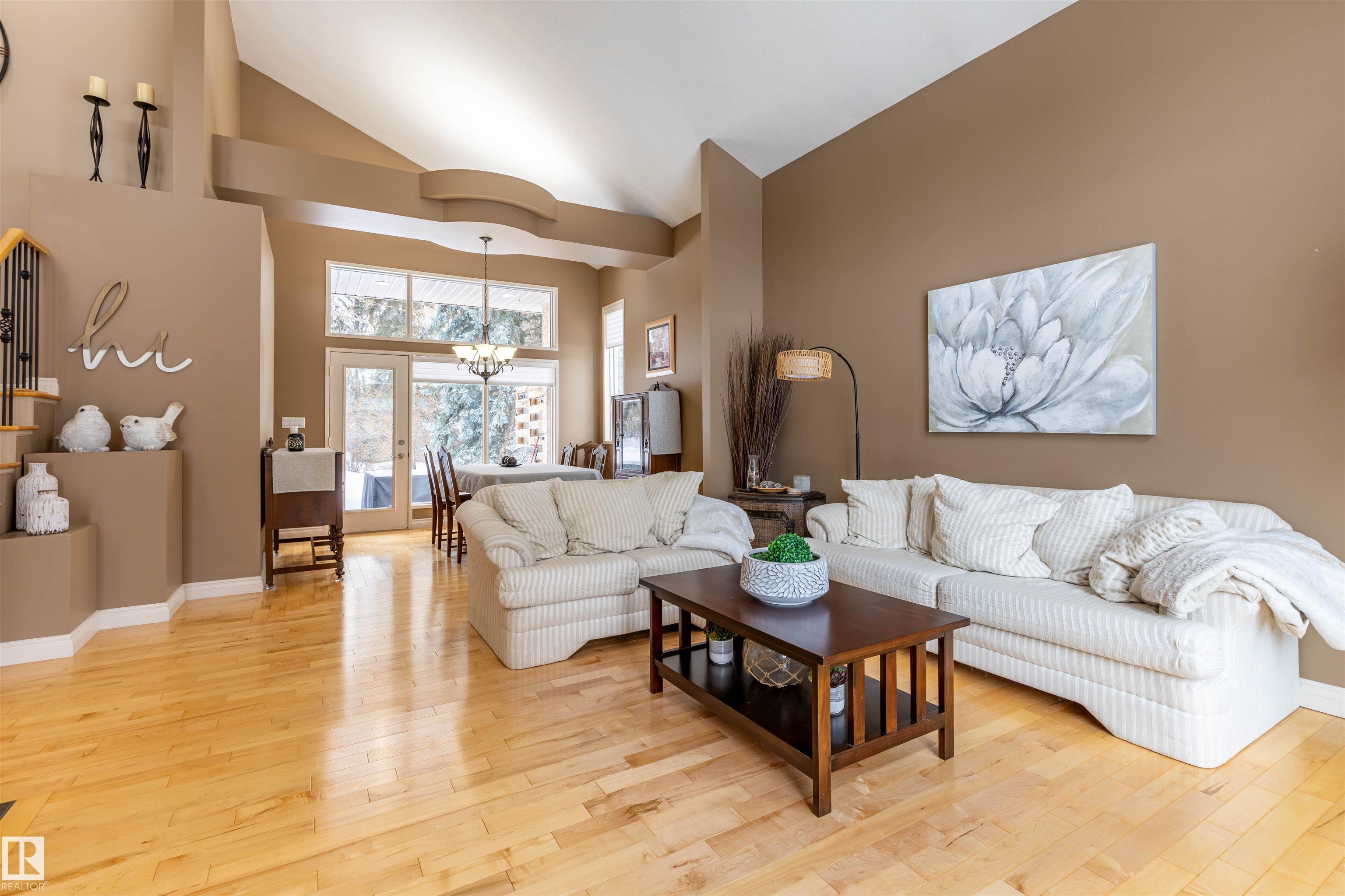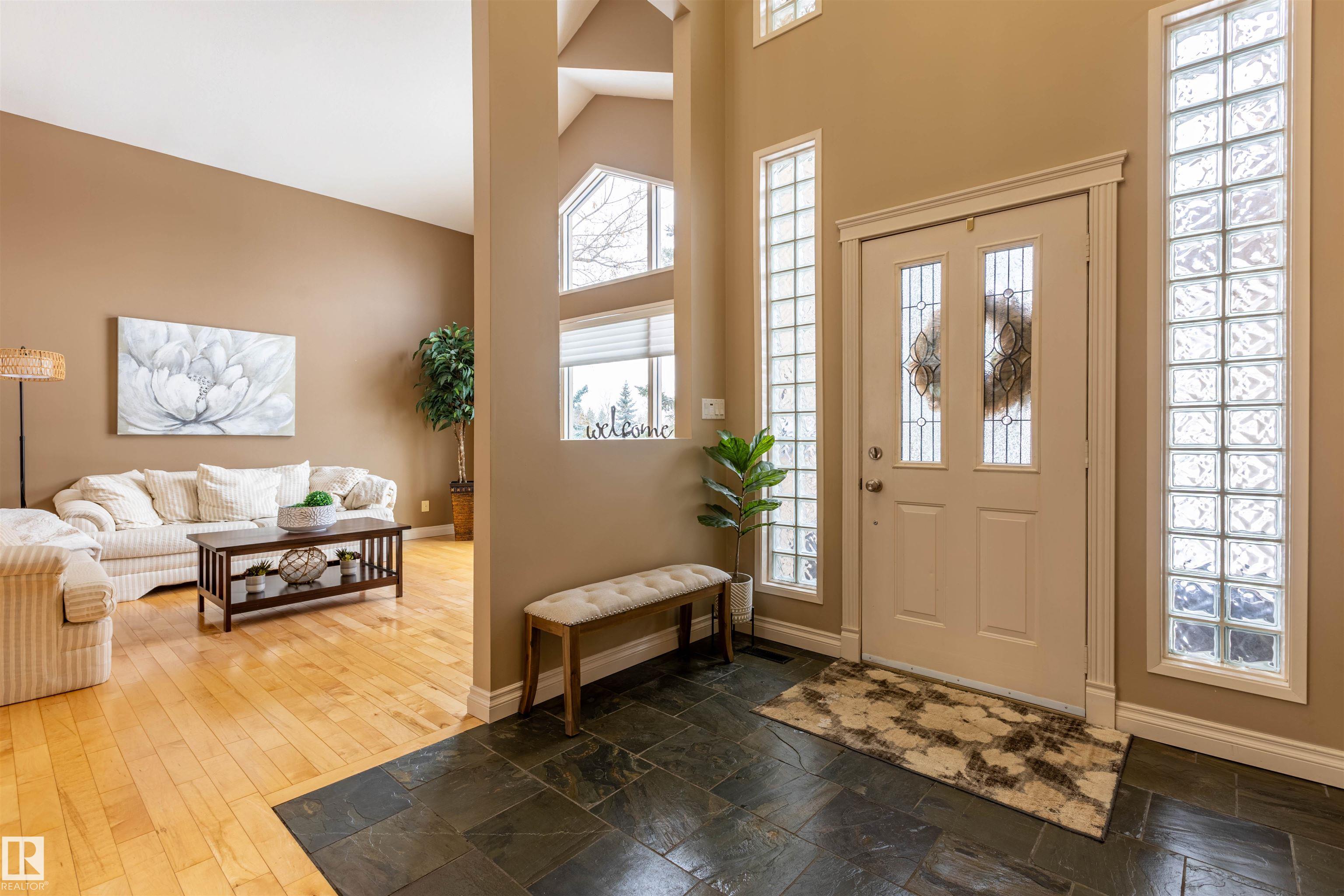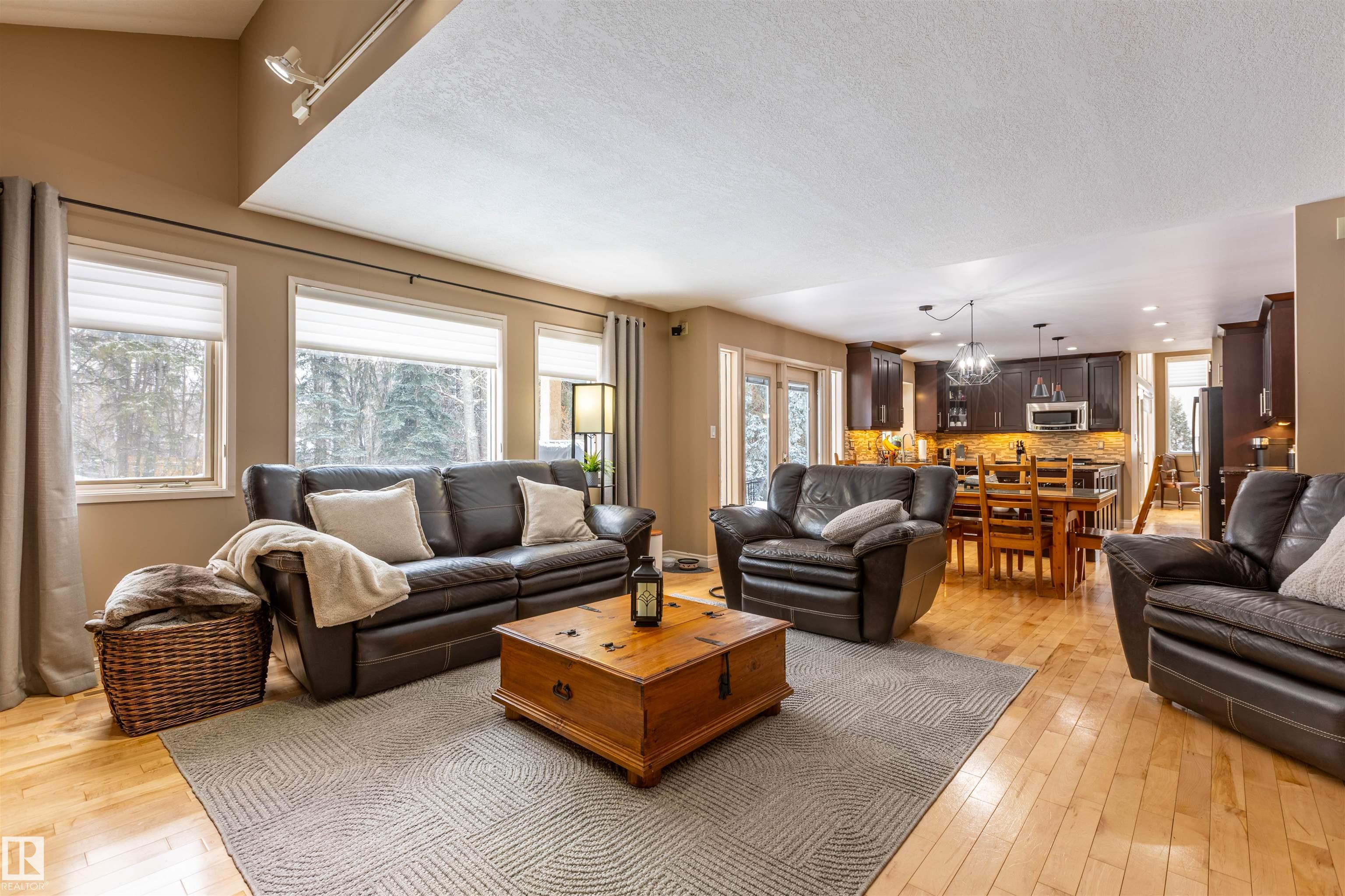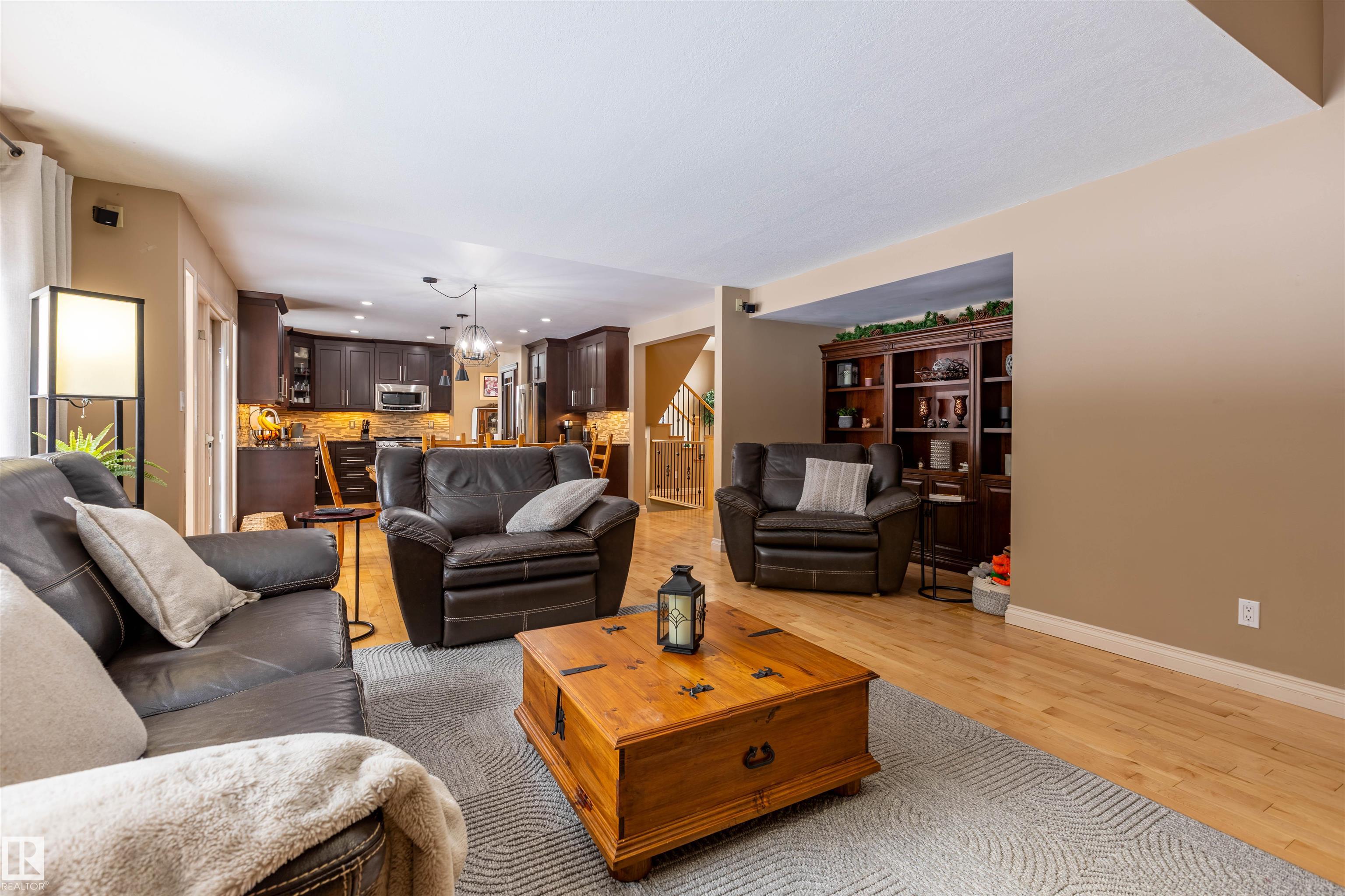 Welcome to the prestigious Estates of Sherwood Park! Tucked away on a quiet, private lot surrounded by mature trees, this beautiful 2700+ SqFt, 5 bed, 4 bath home features a heated triple attached garage, RV parking, 220V wiring, Central A/C, and an unbeatable location. A grand foyer leads to the bright family room and formal dining area before opening to a spacious kitchen and inviting living room with built-in sound system, perfect for entertaining. The main floor also features a large office and mudroom off the garage. Upstairs offers a massive primary retreat with a private south-facing balcony overlooking the backyard, a luxurious 6-pc ensuite with heated floors, two walk-in closets, two additional bedrooms, and convenient upstairs laundry. The fully finished basement includes a large recreation room with built-in speakers and projector, two bedrooms, and a 3-pc bath. Enjoy the sunny south-facing backyard with mature trees, full fencing, landscaping, and a large deck. Some photos contain AI staging.