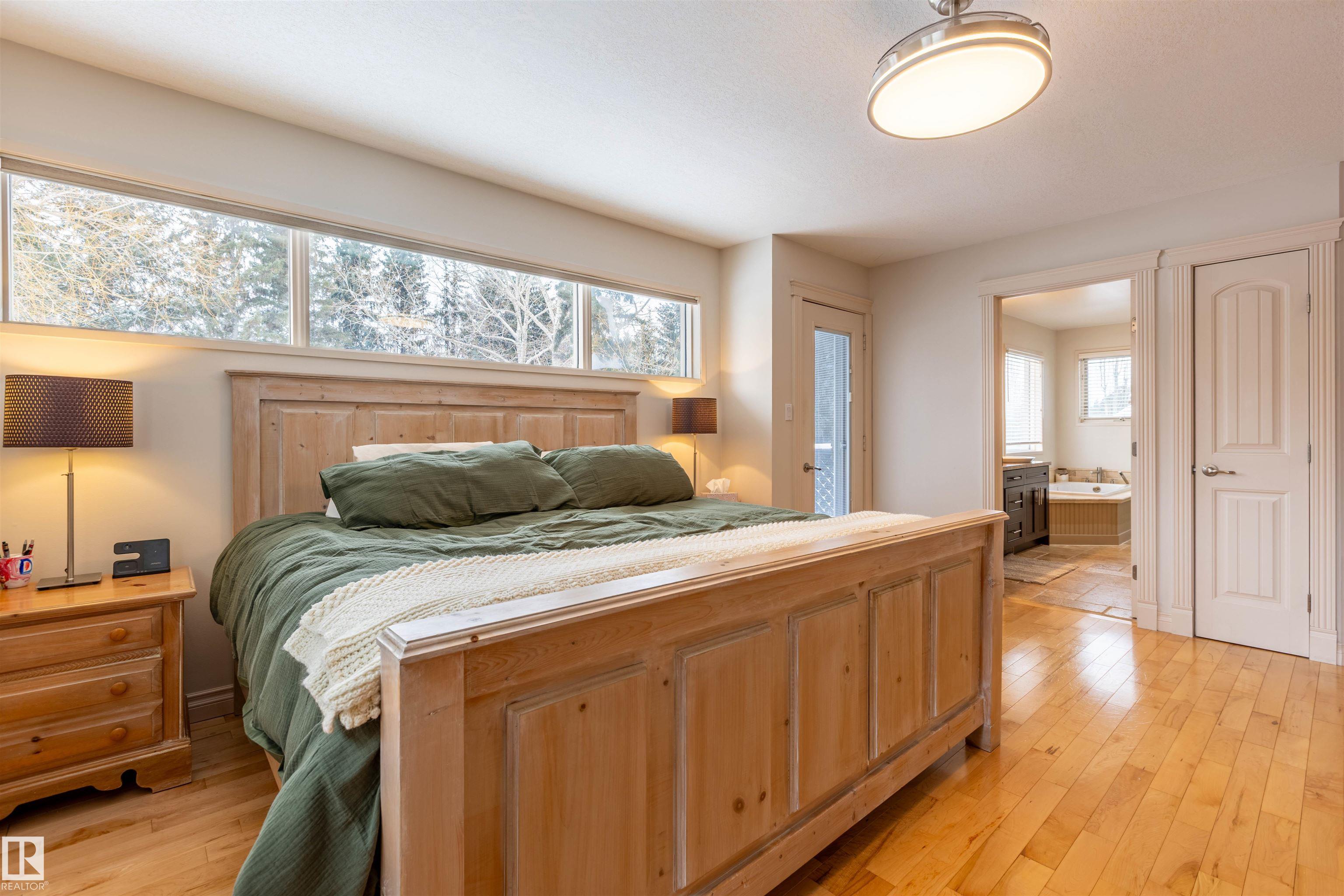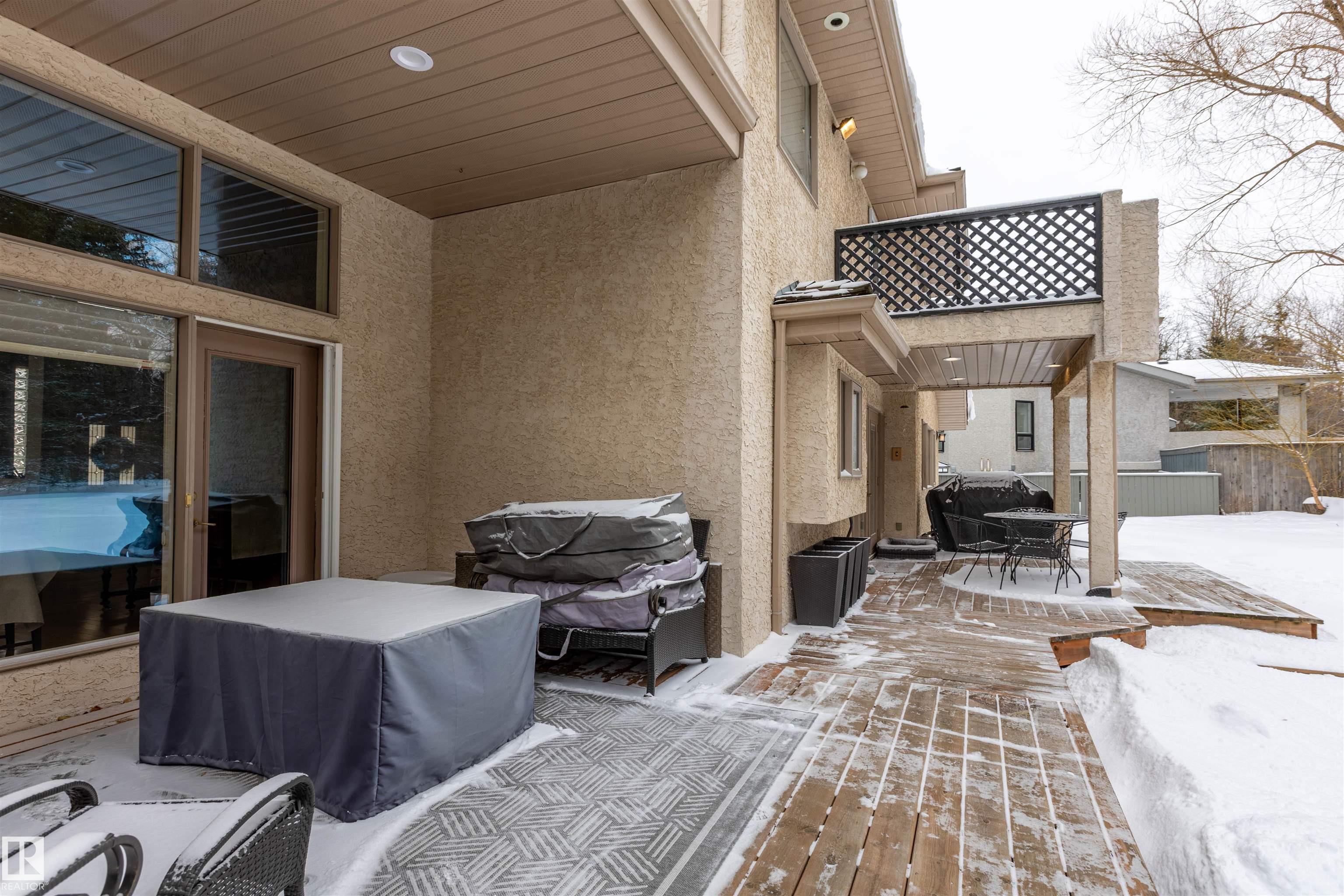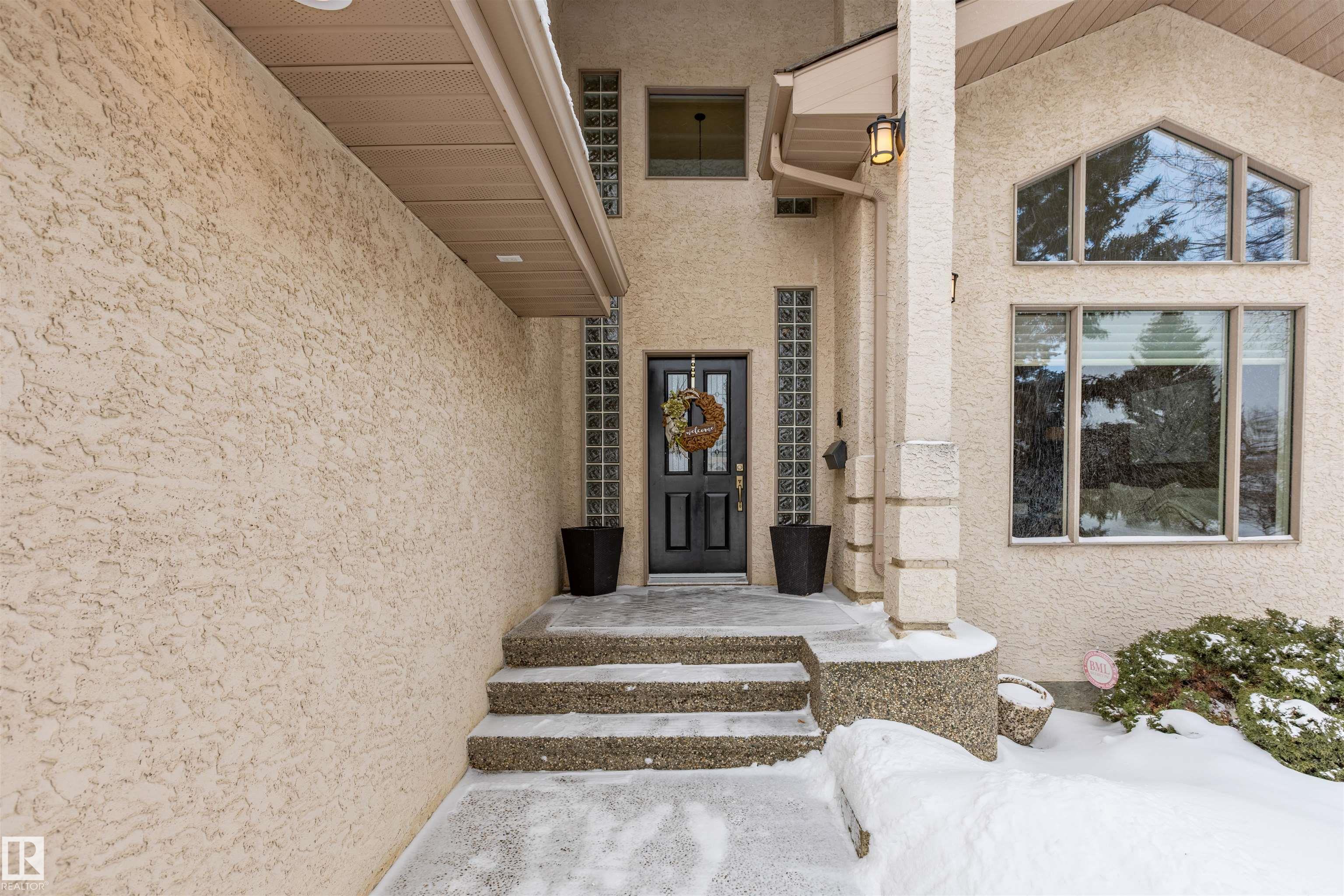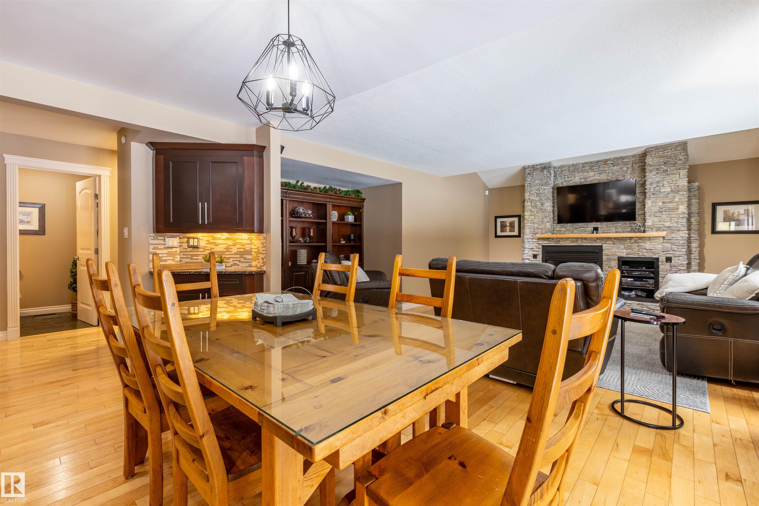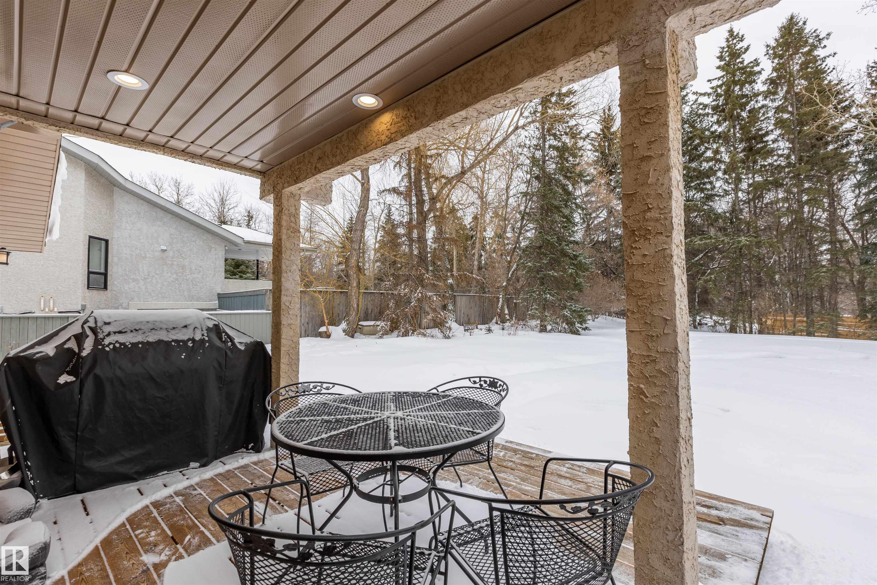 Welcome to the prestigious Estates of Sherwood Park! Tucked away on a quiet, private lot surrounded by mature trees, this beautiful 2700+ SqFt, 5 bed, 4 bath home features a heated triple attached garage, RV parking, 220V wiring, Central A/C, and an unbeatable location. A grand foyer leads to the bright family room and formal dining area before opening to a spacious kitchen and inviting living room with built-in sound system, perfect for entertaining. The main floor also features a large office and mudroom off the garage. Upstairs offers a massive primary retreat with a private south-facing balcony overlooking the backyard, a luxurious 6-pc ensuite with heated floors, two walk-in closets, two additional bedrooms, and convenient upstairs laundry. The fully finished basement includes a large recreation room with built-in speakers and projector, two bedrooms, and a 3-pc bath. Enjoy the sunny south-facing backyard with mature trees, full fencing, landscaping, and a large deck. Some photos contain AI staging.