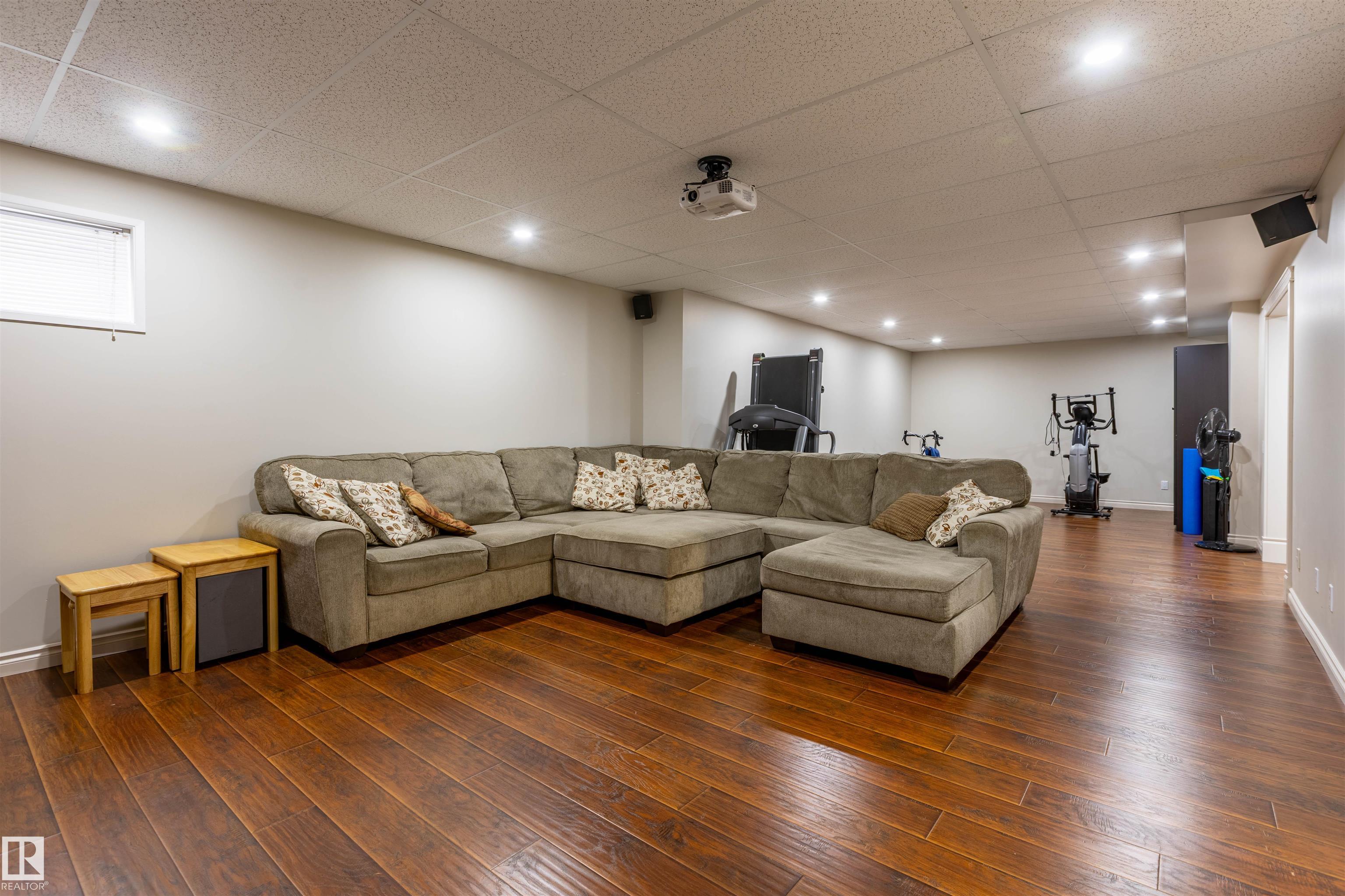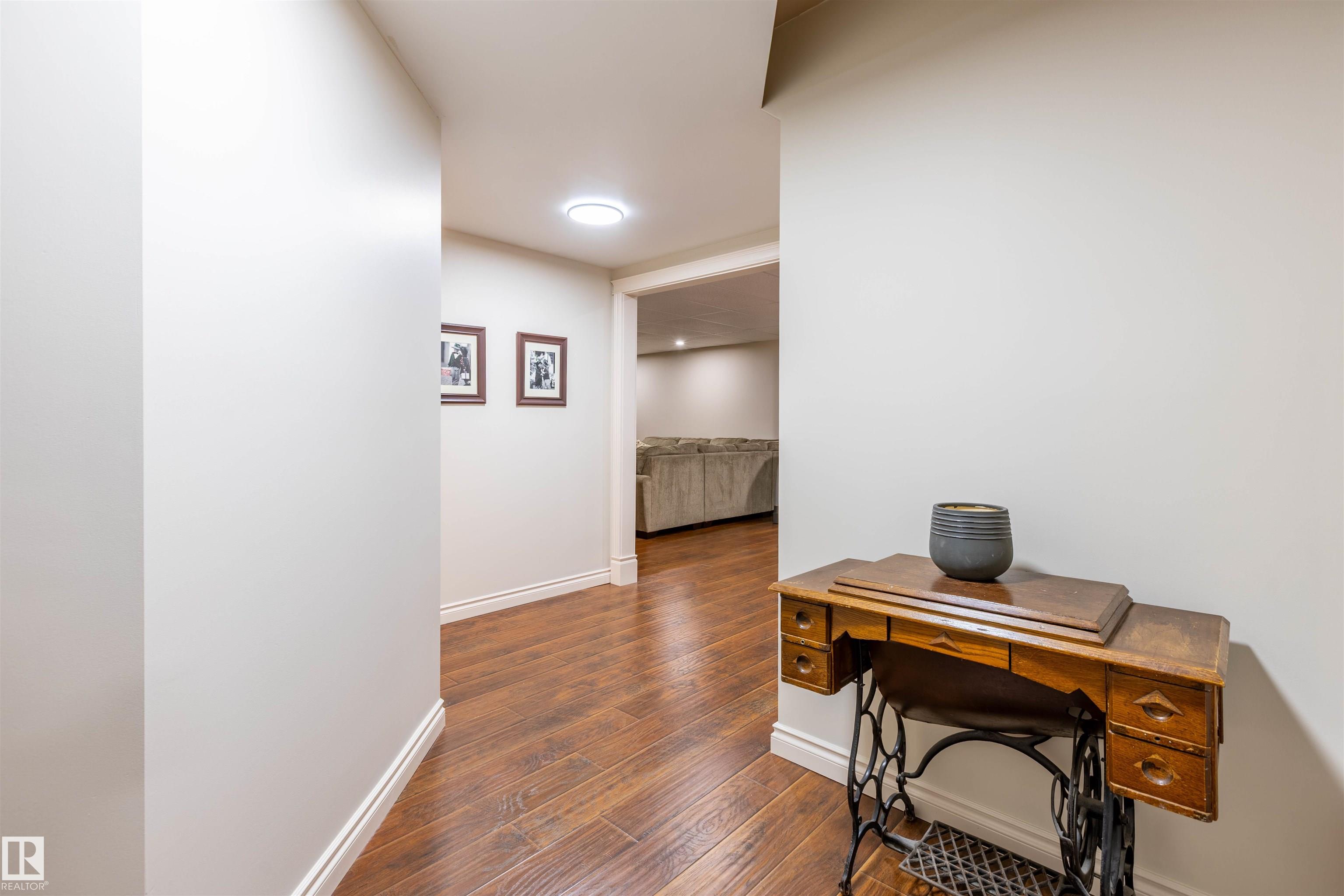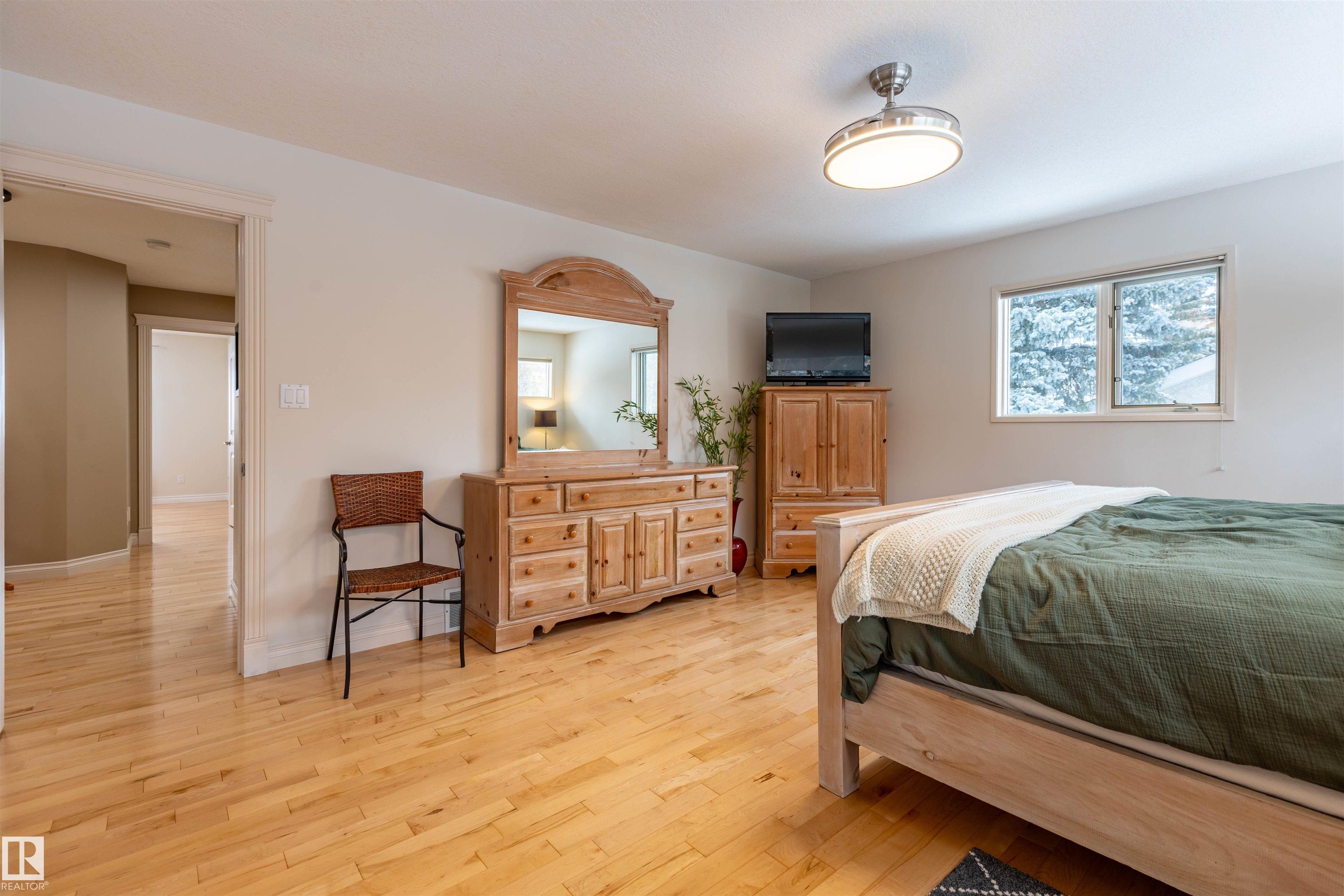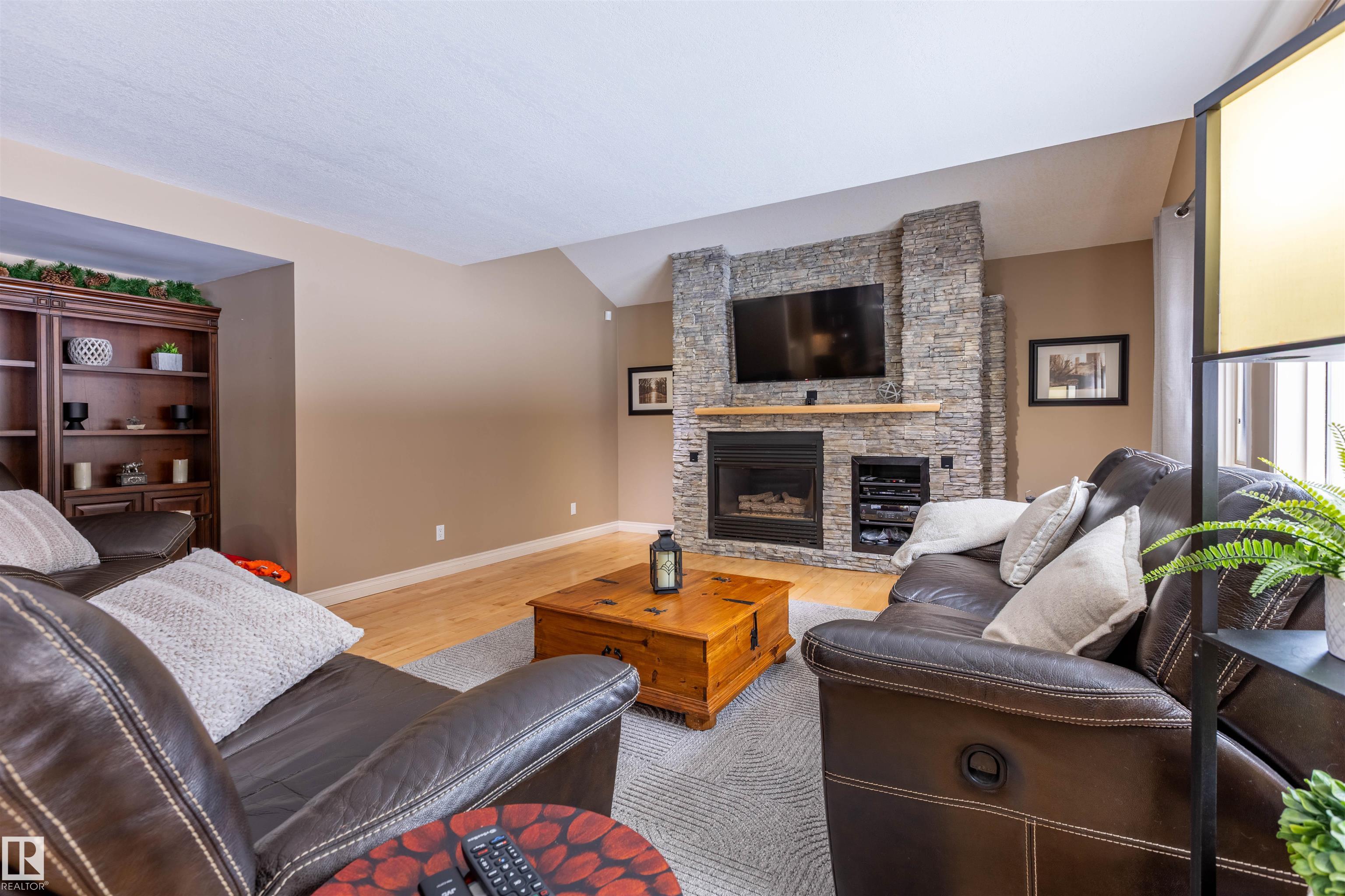 Welcome to the prestigious Estates of Sherwood Park! Tucked away on a quiet, private lot surrounded by mature trees, this beautiful 2700+ SqFt, 5 bed, 4 bath home features a heated triple attached garage, RV parking, 220V wiring, Central A/C, and an unbeatable location. A grand foyer leads to the bright family room and formal dining area before opening to a spacious kitchen and inviting living room with built-in sound system, perfect for entertaining. The main floor also features a large office and mudroom off the garage. Upstairs offers a massive primary retreat with a private south-facing balcony overlooking the backyard, a luxurious 6-pc ensuite with heated floors, two walk-in closets, two additional bedrooms, and convenient upstairs laundry. The fully finished basement includes a large recreation room with built-in speakers and projector, two bedrooms, and a 3-pc bath. Enjoy the sunny south-facing backyard with mature trees, full fencing, landscaping, and a large deck. Some photos contain AI staging.