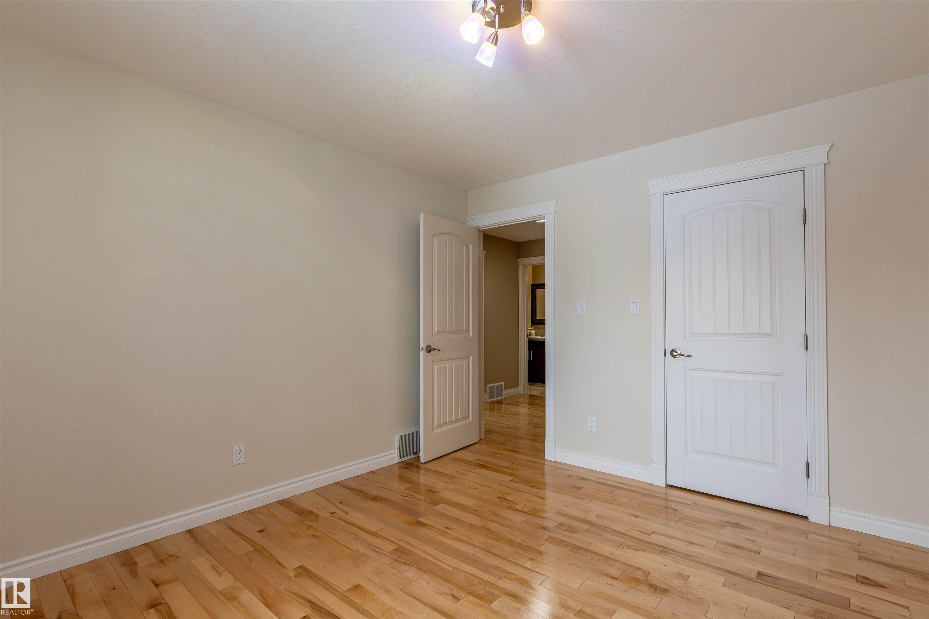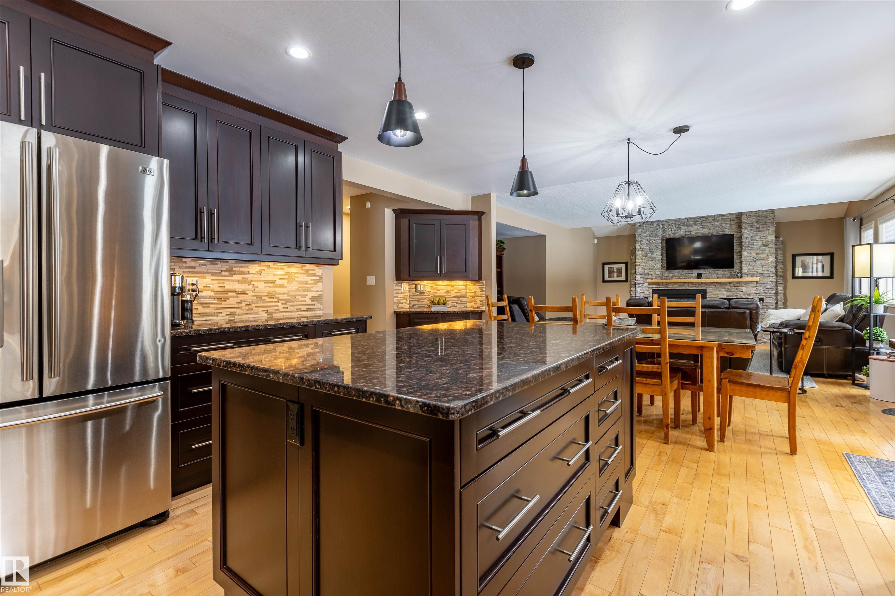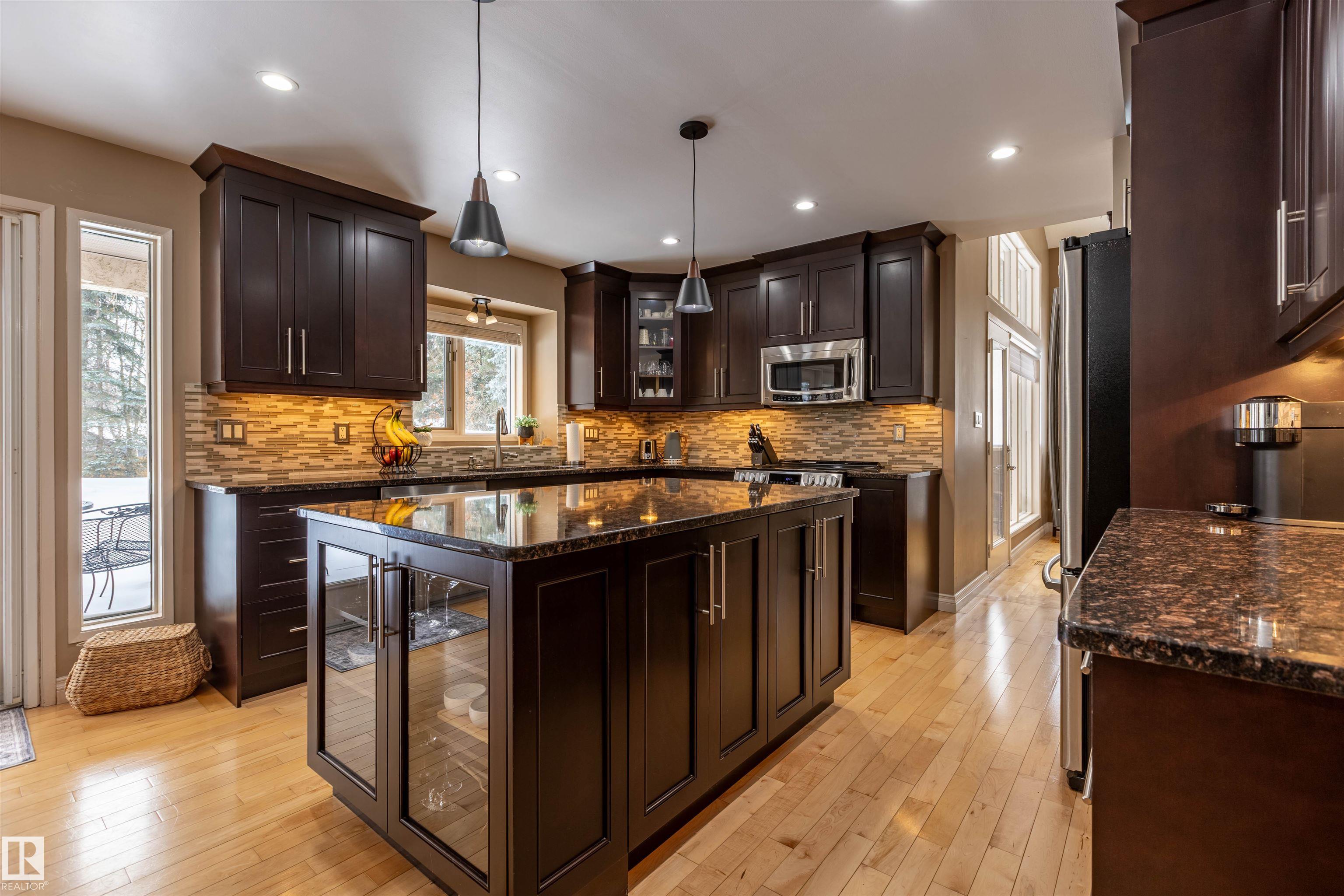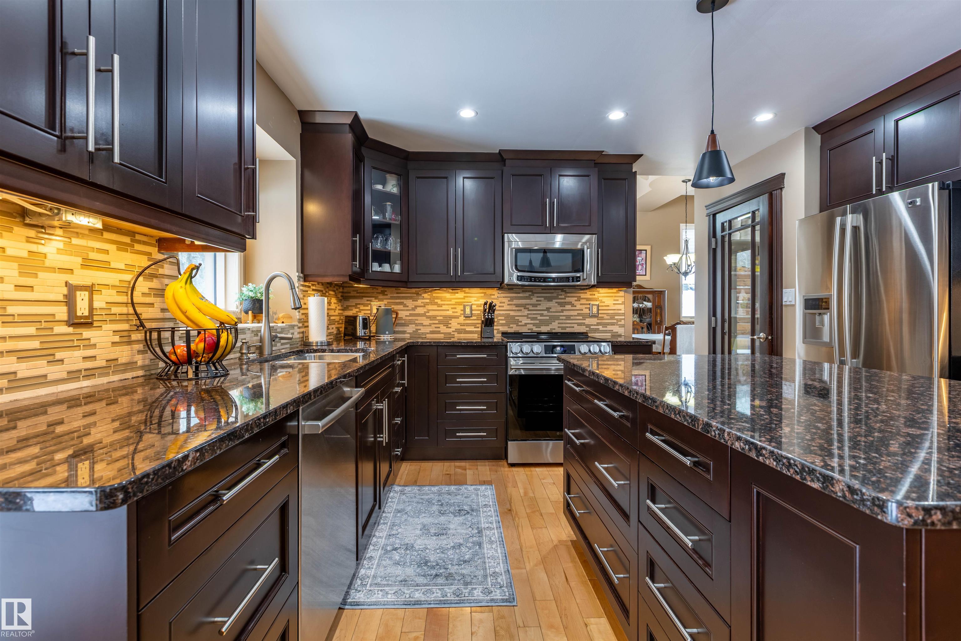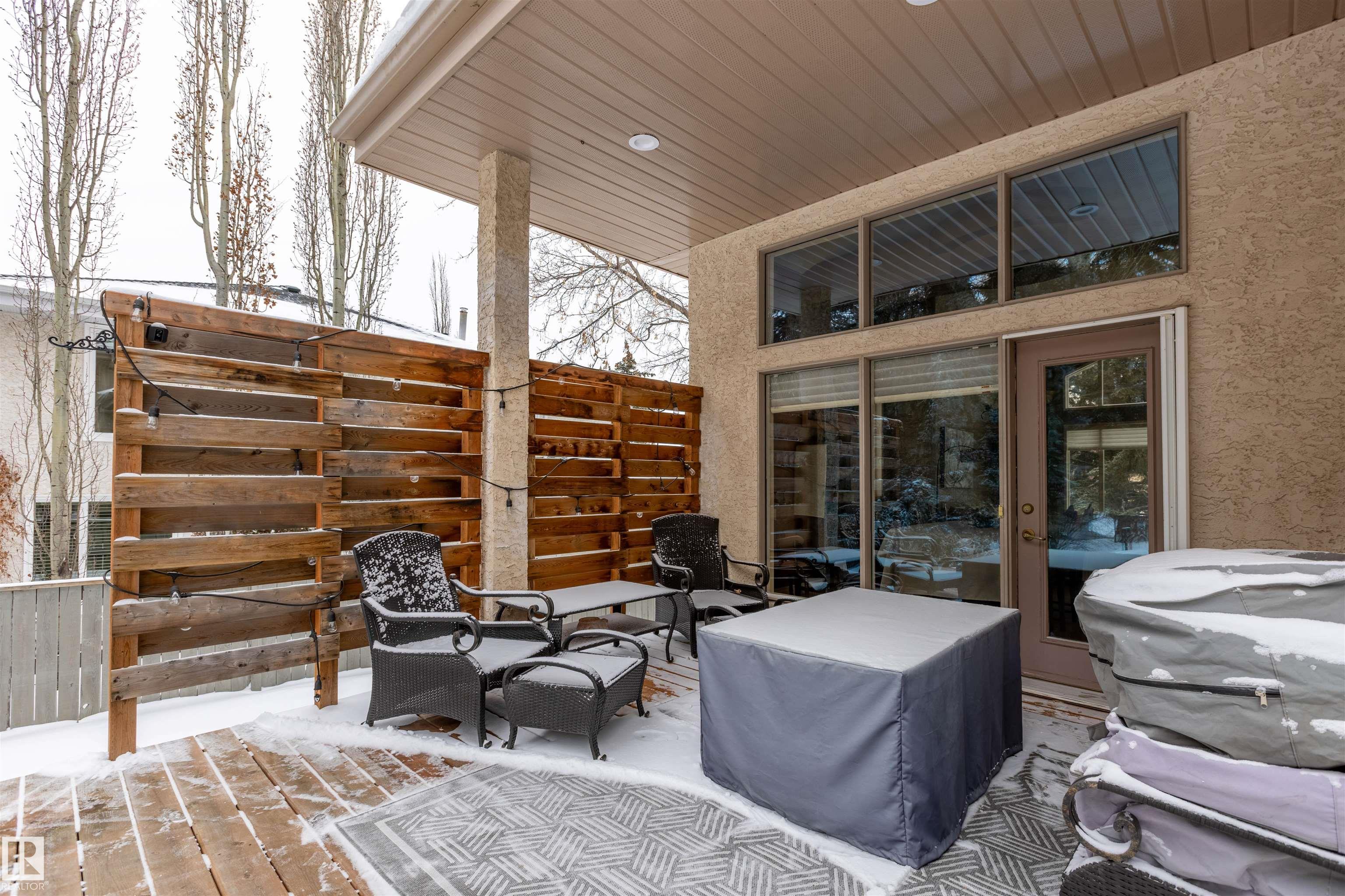 Welcome to the prestigious Estates of Sherwood Park! Tucked away on a quiet, private lot surrounded by mature trees, this beautiful 2700+ SqFt, 5 bed, 4 bath home features a heated triple attached garage, RV parking, 220V wiring, Central A/C, and an unbeatable location. A grand foyer leads to the bright family room and formal dining area before opening to a spacious kitchen and inviting living room with built-in sound system, perfect for entertaining. The main floor also features a large office and mudroom off the garage. Upstairs offers a massive primary retreat with a private south-facing balcony overlooking the backyard, a luxurious 6-pc ensuite with heated floors, two walk-in closets, two additional bedrooms, and convenient upstairs laundry. The fully finished basement includes a large recreation room with built-in speakers and projector, two bedrooms, and a 3-pc bath. Enjoy the sunny south-facing backyard with mature trees, full fencing, landscaping, and a large deck. Some photos contain AI staging.