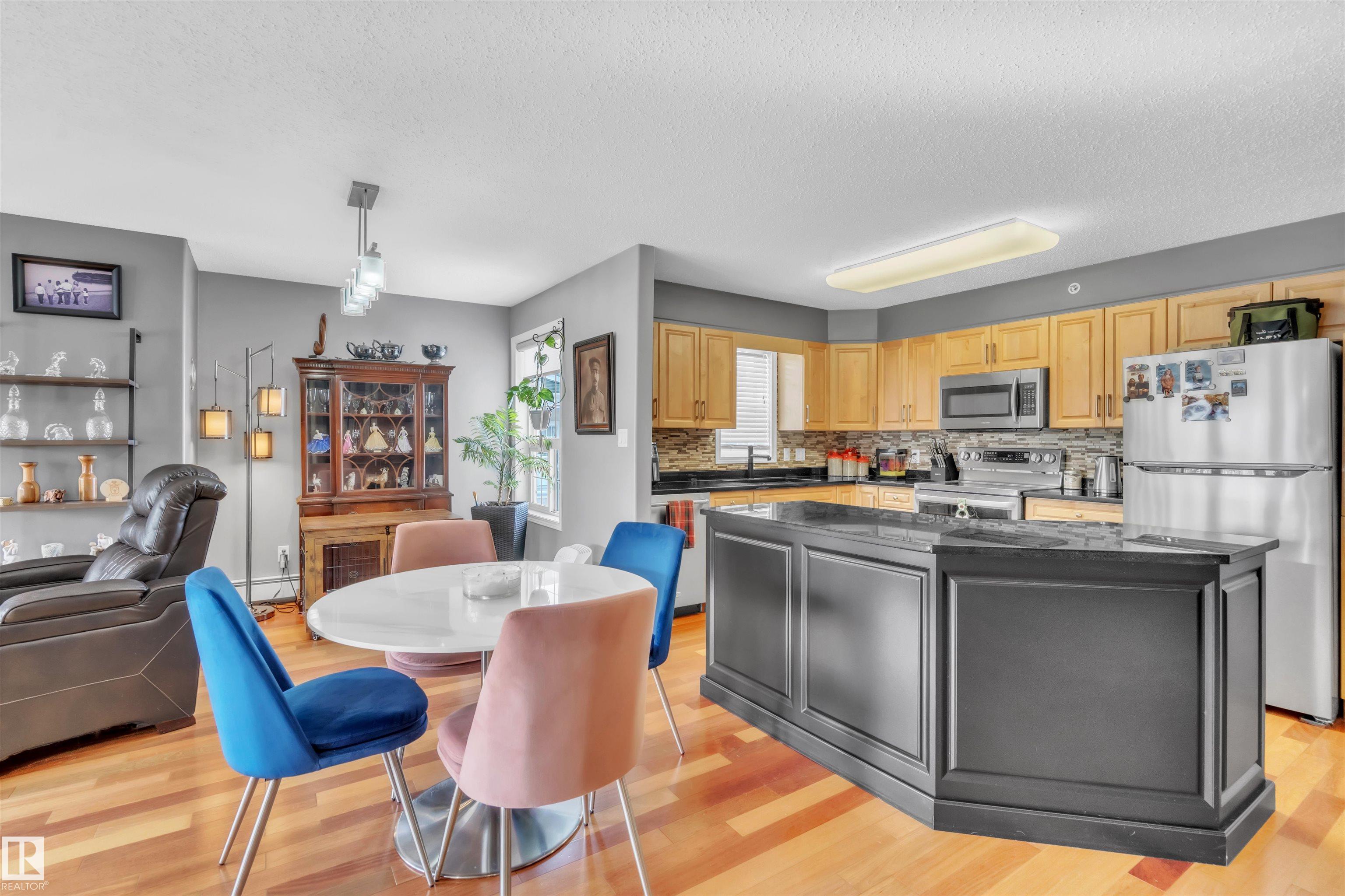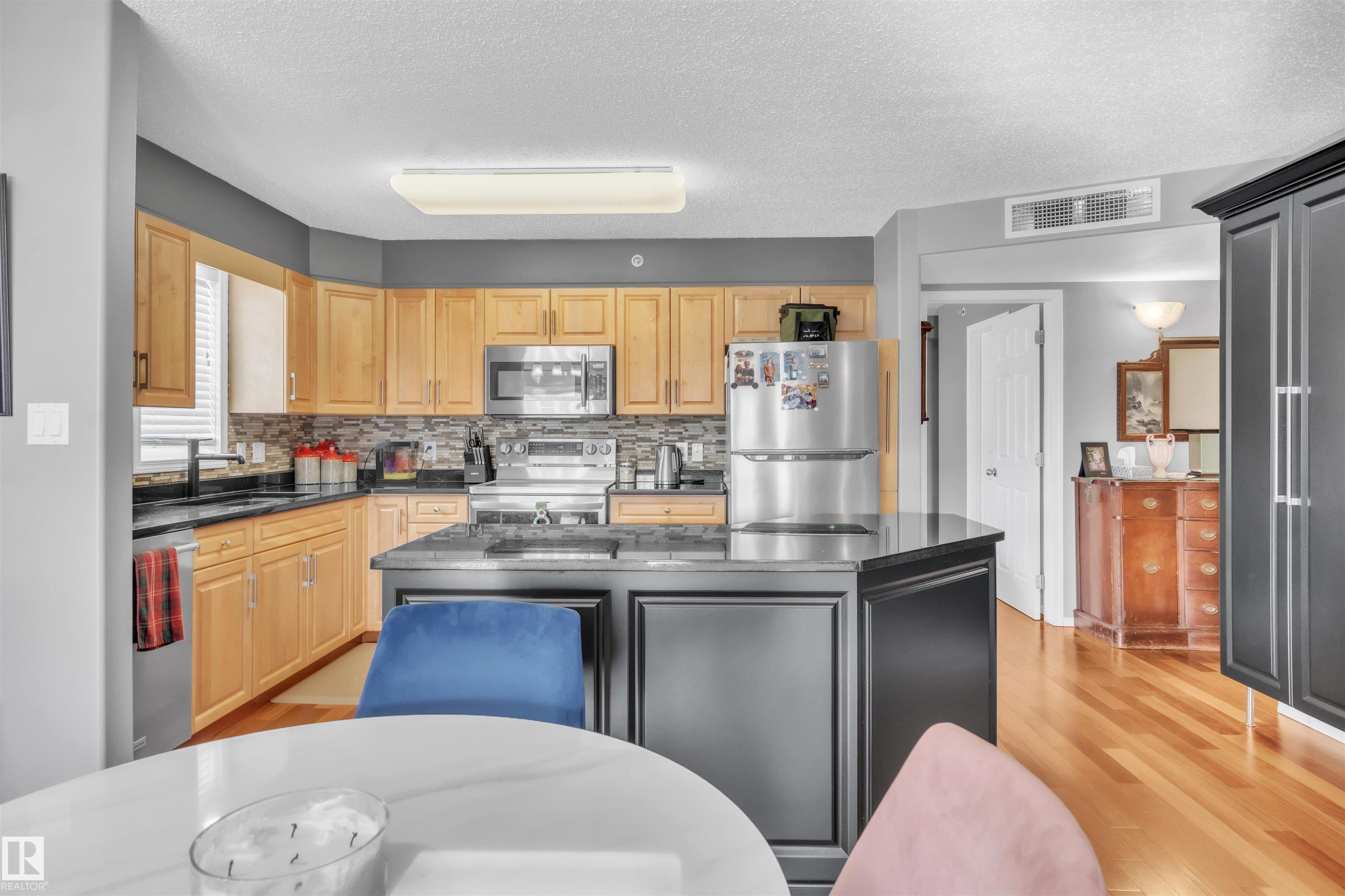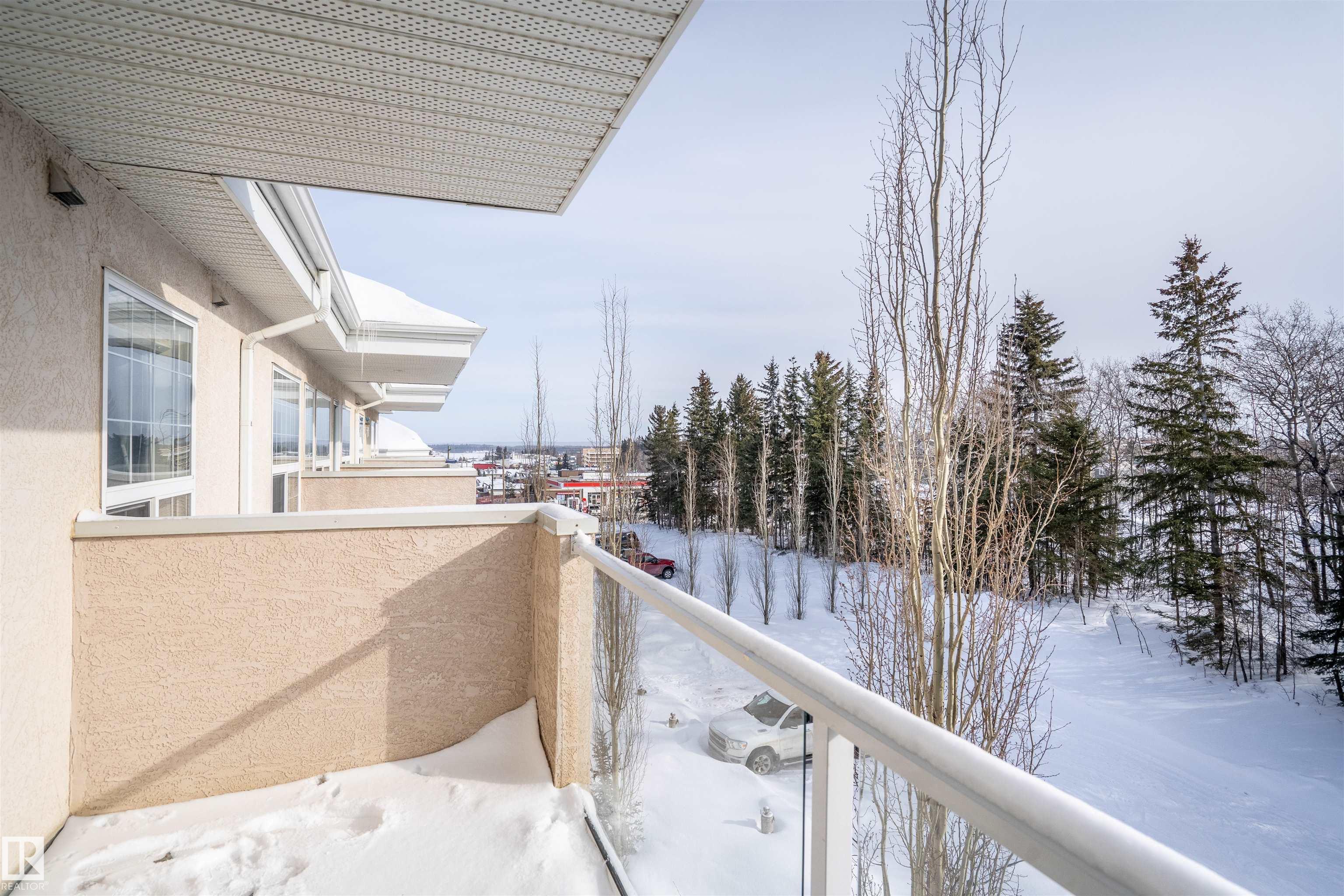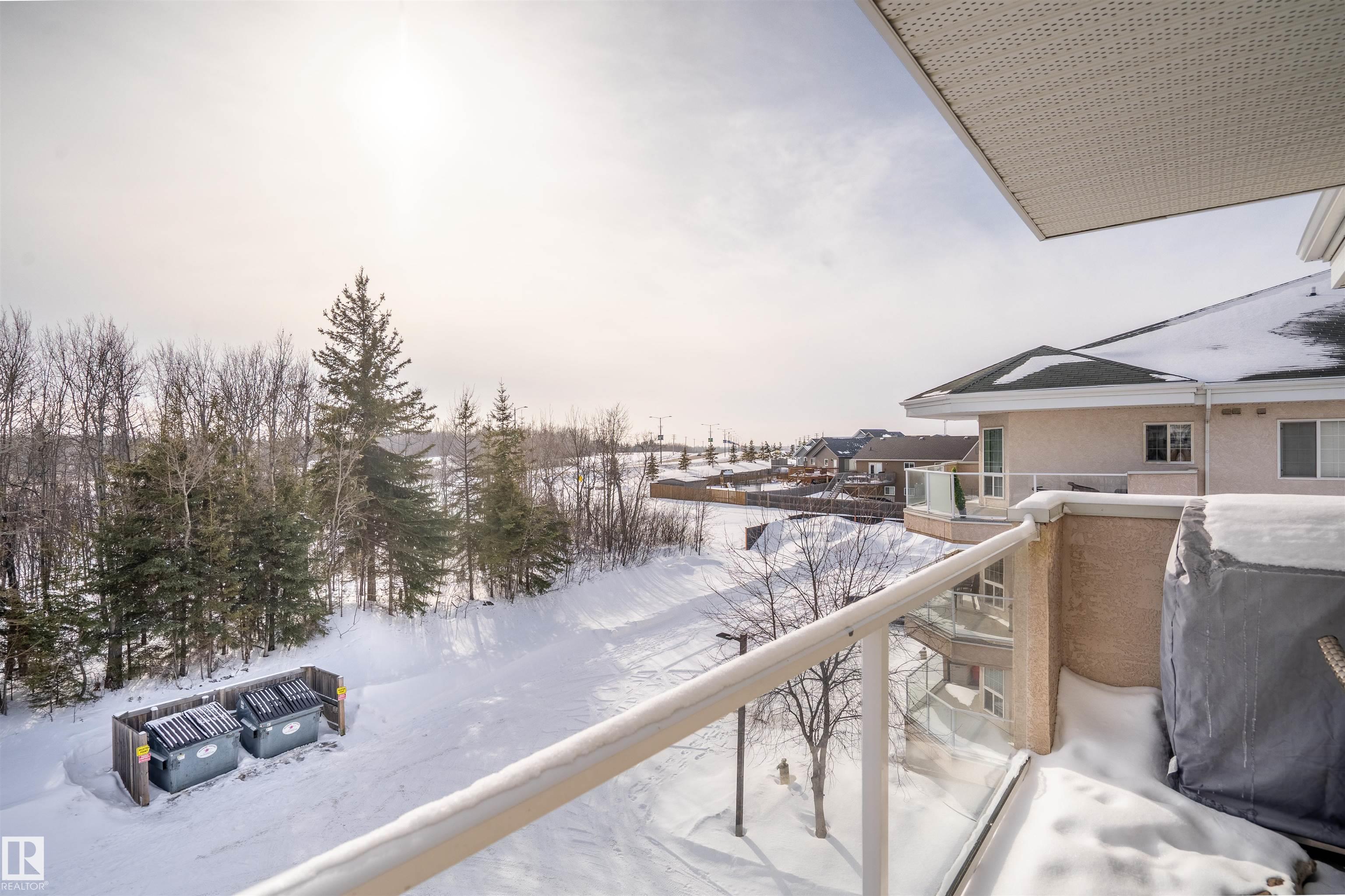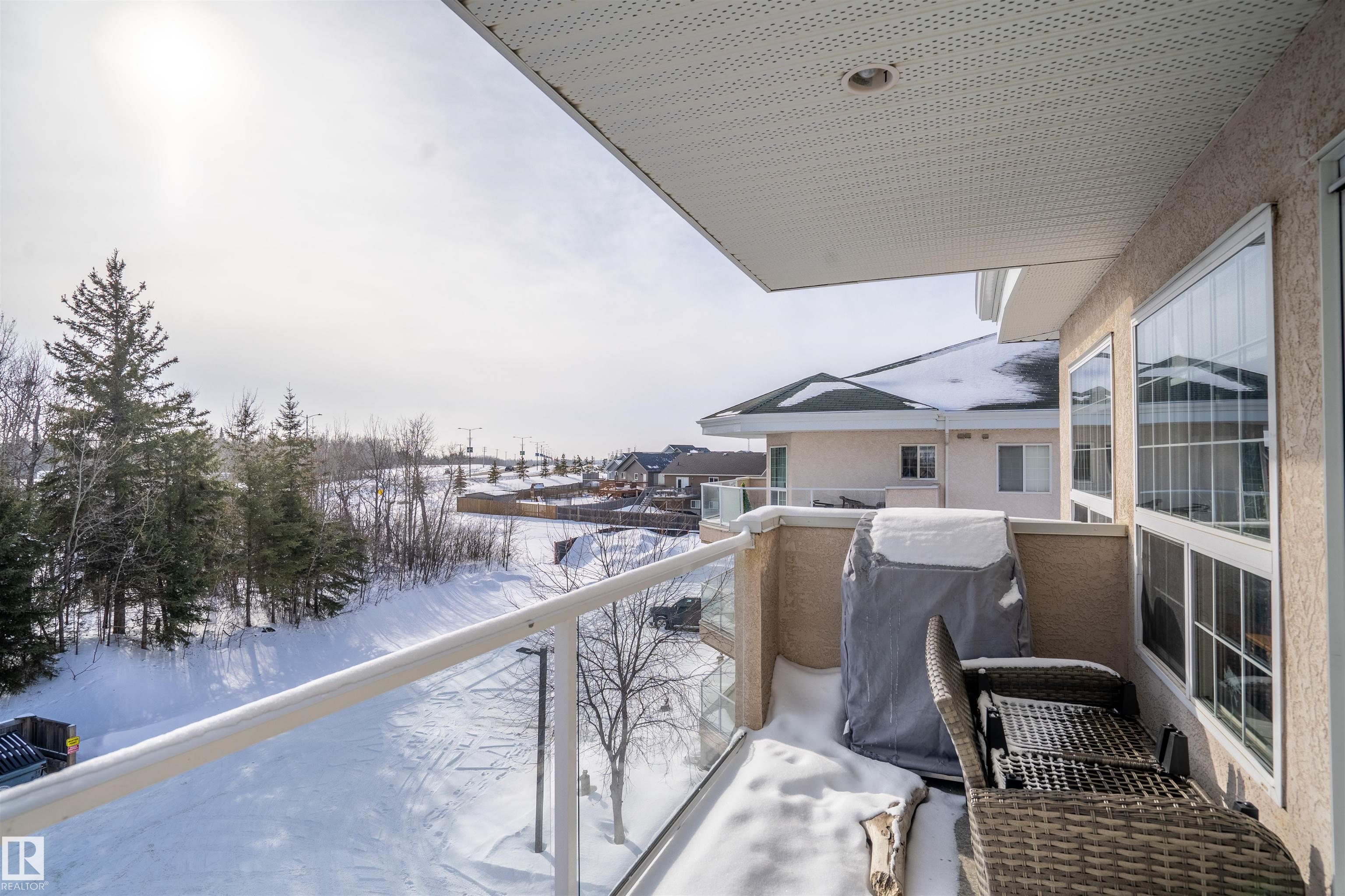 Top-floor 2-bedroom condo backing onto nature! This immaculate, move-in-ready unit offers 1,200 sq ft with an open-concept kitchen, dining, and living area designed for comfortable everyday living. The spacious kitchen features maple cabinetry, granite countertops, stainless steel appliances, and a convenient eat-up island. The living room is filled with natural light thanks to well-placed windows that overlook the surrounding forest. Step out onto the private patio just off the living room, which faces the trees and includes a natural gas hookup for your BBQ. The primary bedroom provides a relaxing retreat with space for a king-sized bed, a walk-in closet with built-in shelving, and a 3-piece ensuite. A second generously sized bedroom, 4-piece main bathroom, and laundry room complete the layout. This unit also includes central A/C, one heated underground parking stall with storage, plus an outdoor energized stall. The building offers a secure entrance, elevator, and a social room.