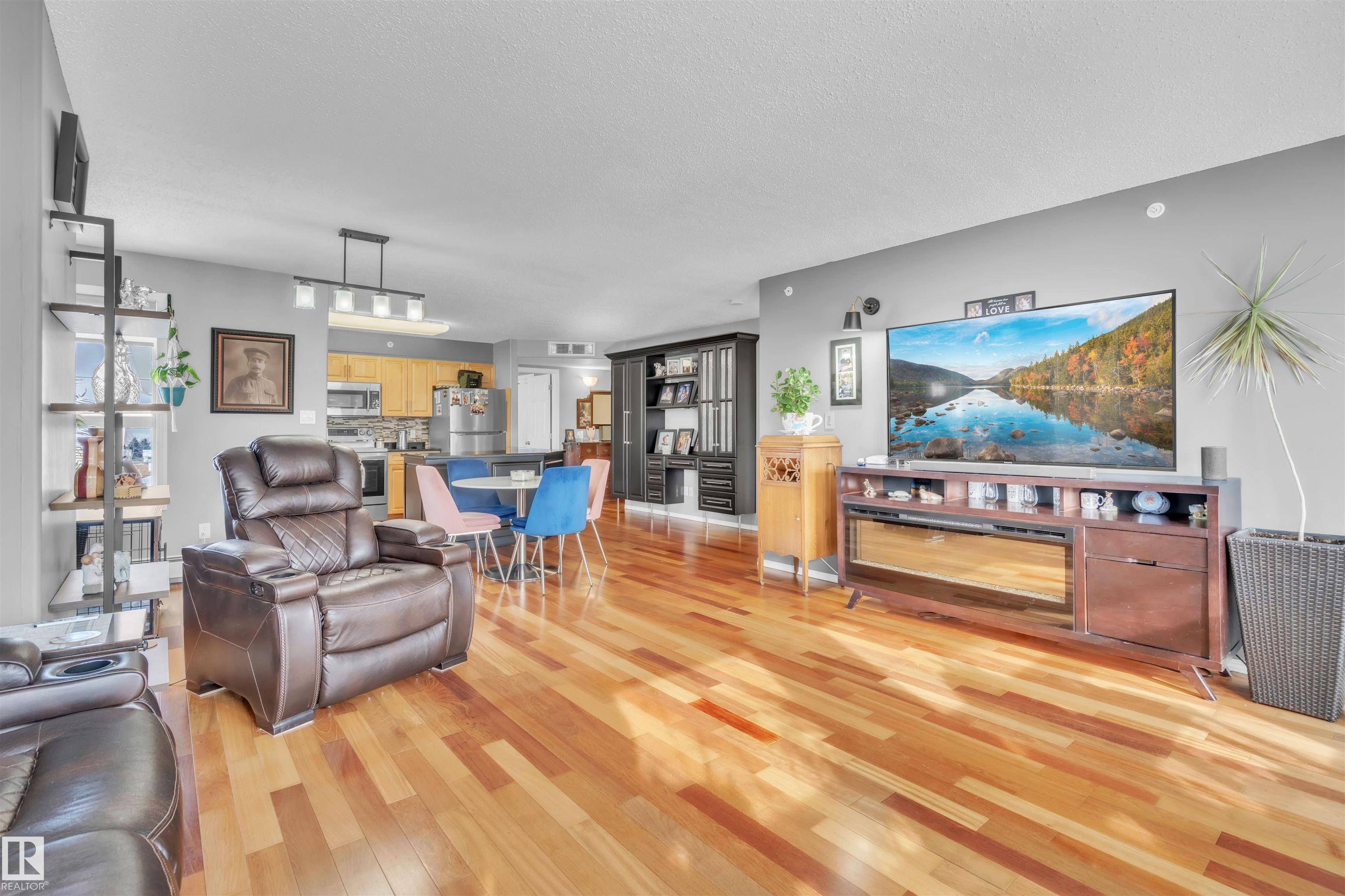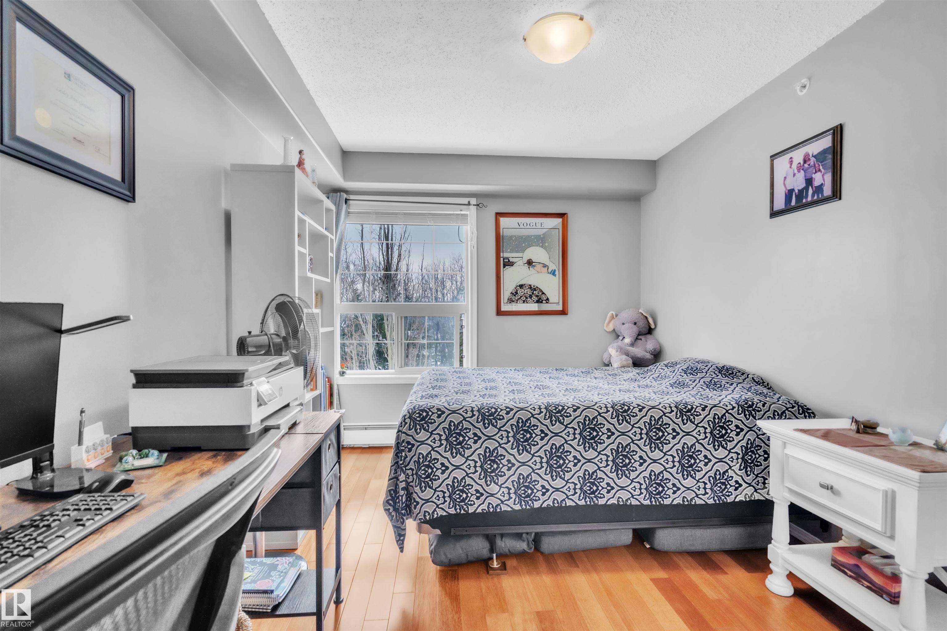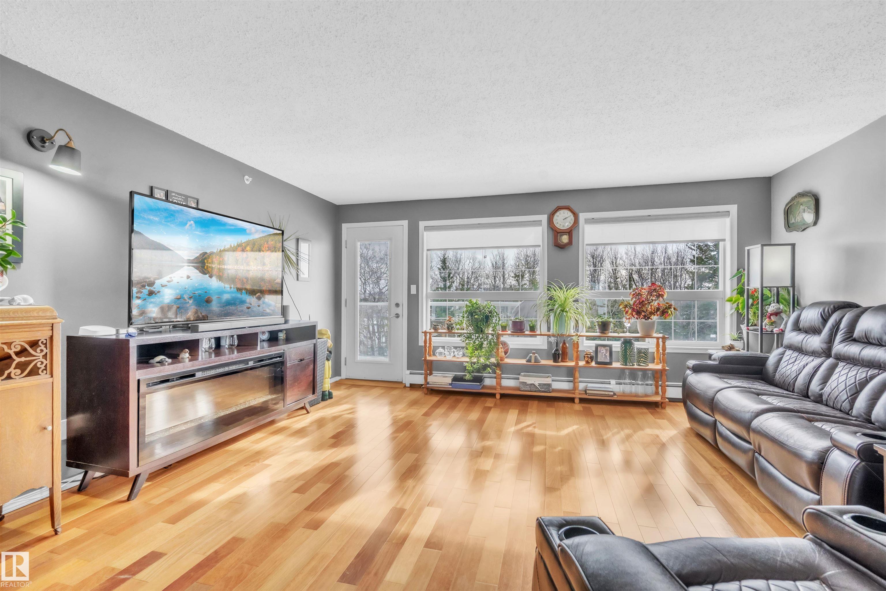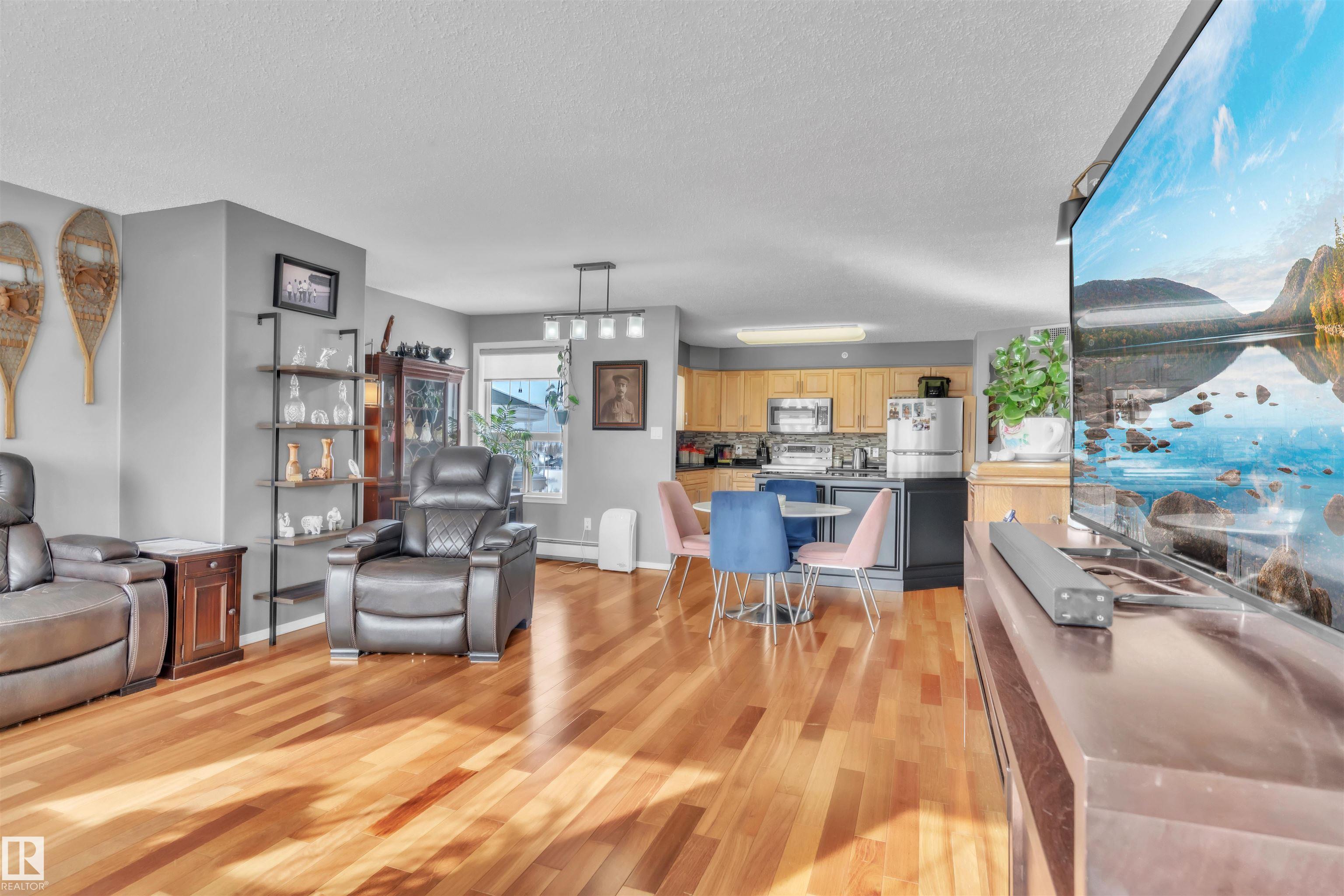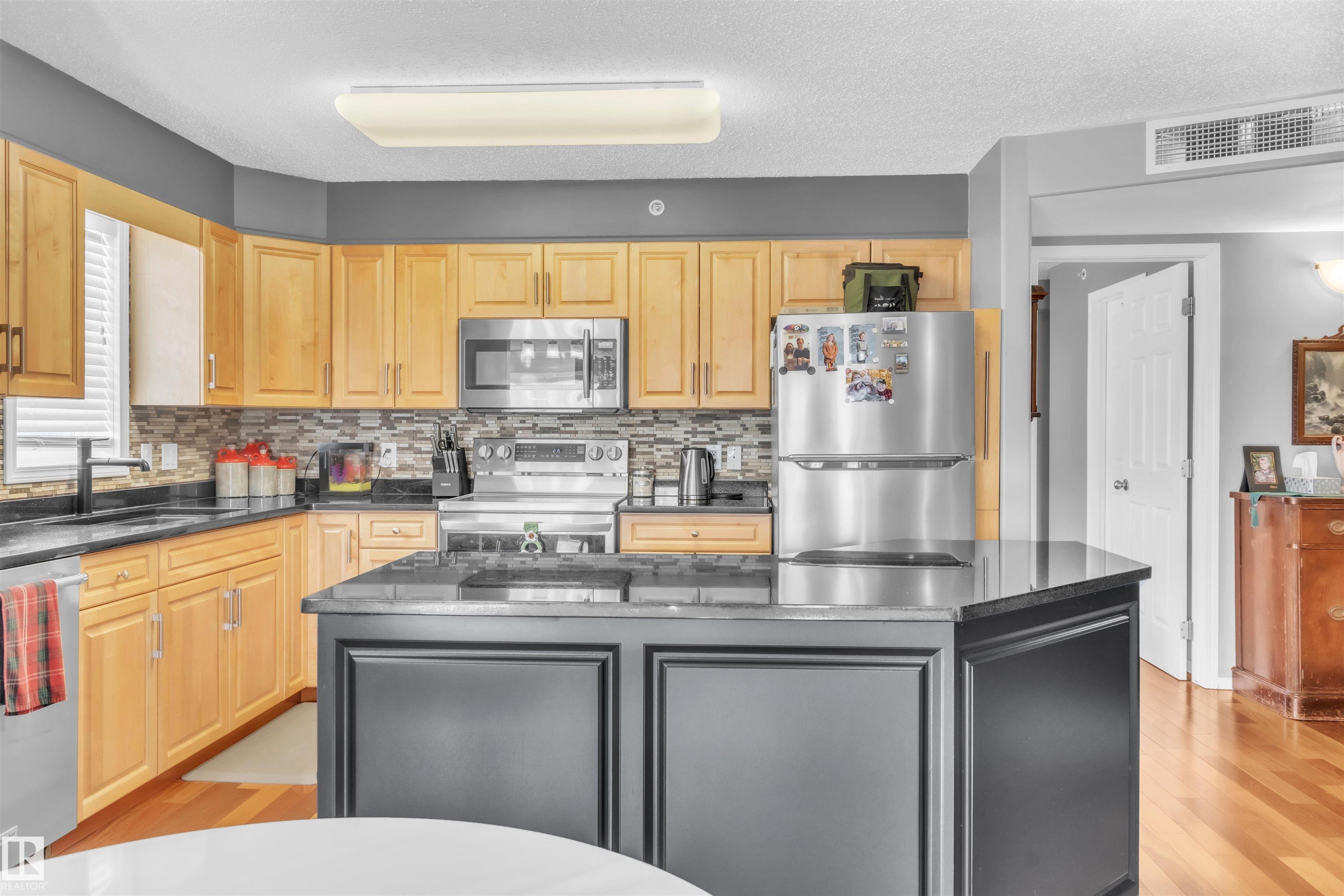 Top-floor 2-bedroom condo backing onto nature! This immaculate, move-in-ready unit offers 1,200 sq ft with an open-concept kitchen, dining, and living area designed for comfortable everyday living. The spacious kitchen features maple cabinetry, granite countertops, stainless steel appliances, and a convenient eat-up island. The living room is filled with natural light thanks to well-placed windows that overlook the surrounding forest. Step out onto the private patio just off the living room, which faces the trees and includes a natural gas hookup for your BBQ. The primary bedroom provides a relaxing retreat with space for a king-sized bed, a walk-in closet with built-in shelving, and a 3-piece ensuite. A second generously sized bedroom, 4-piece main bathroom, and laundry room complete the layout. This unit also includes central A/C, one heated underground parking stall with storage, plus an outdoor energized stall. The building offers a secure entrance, elevator, and a social room.