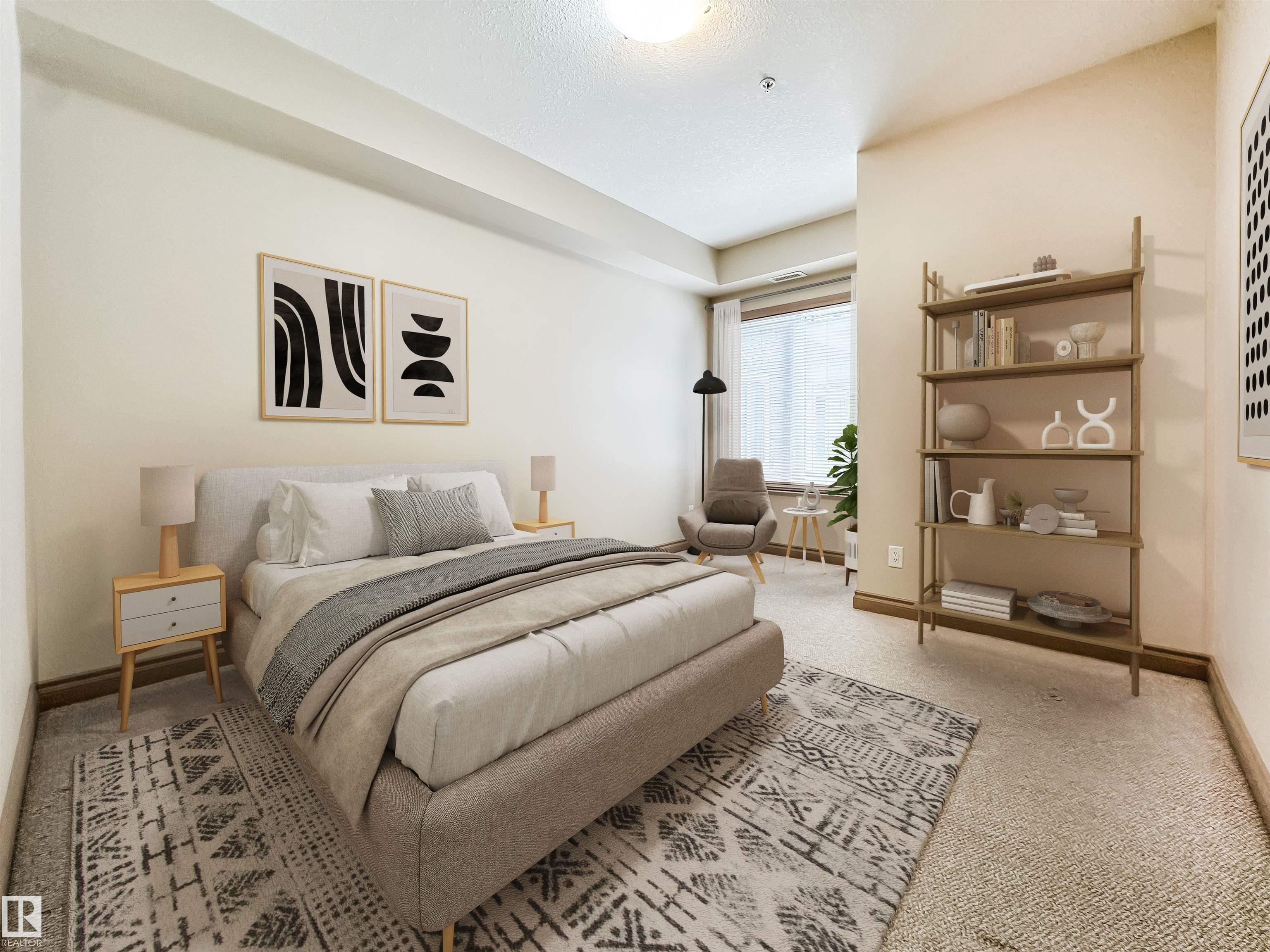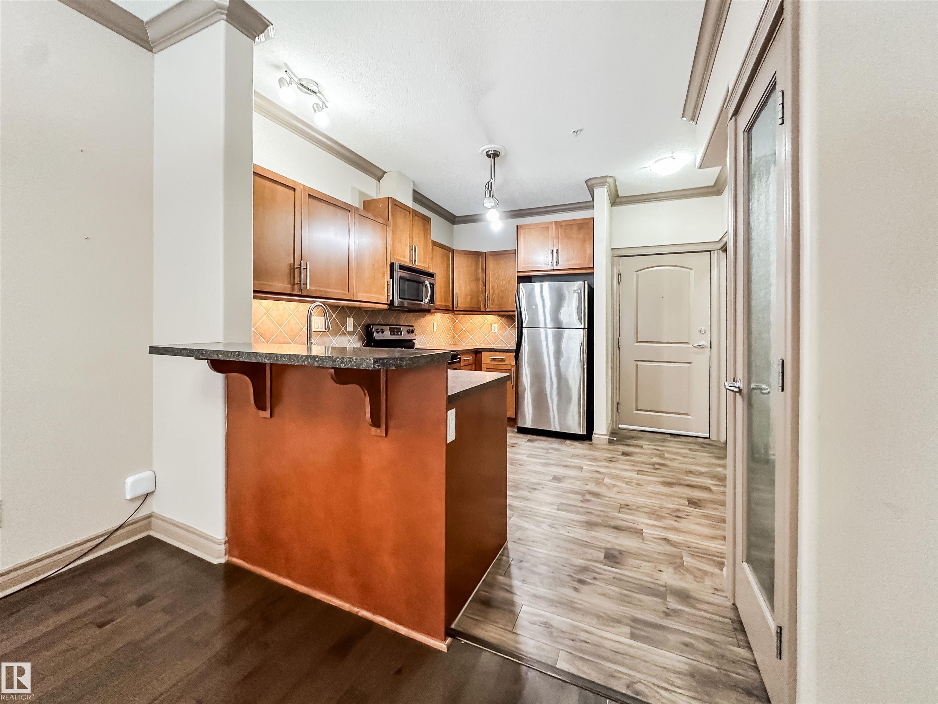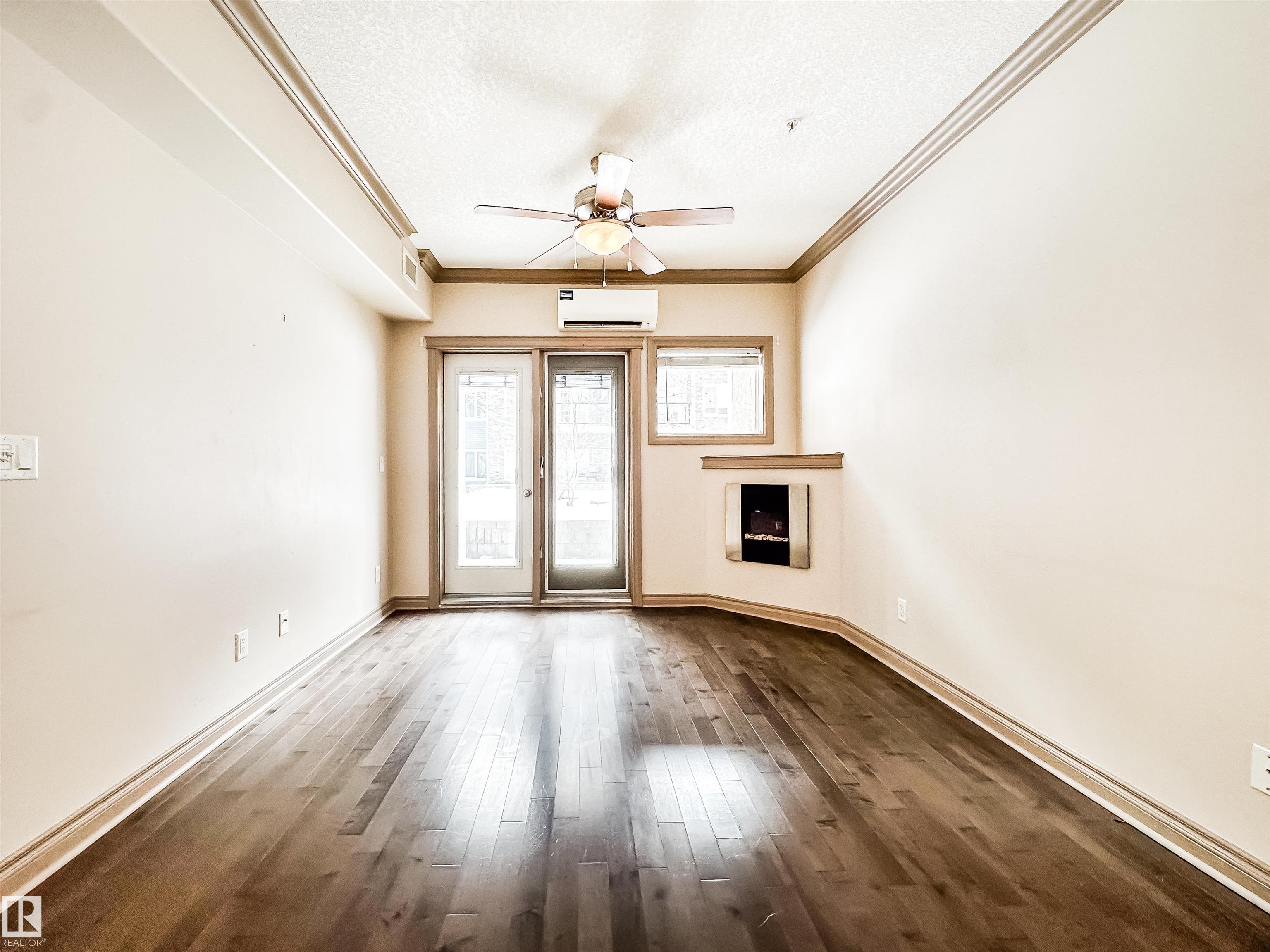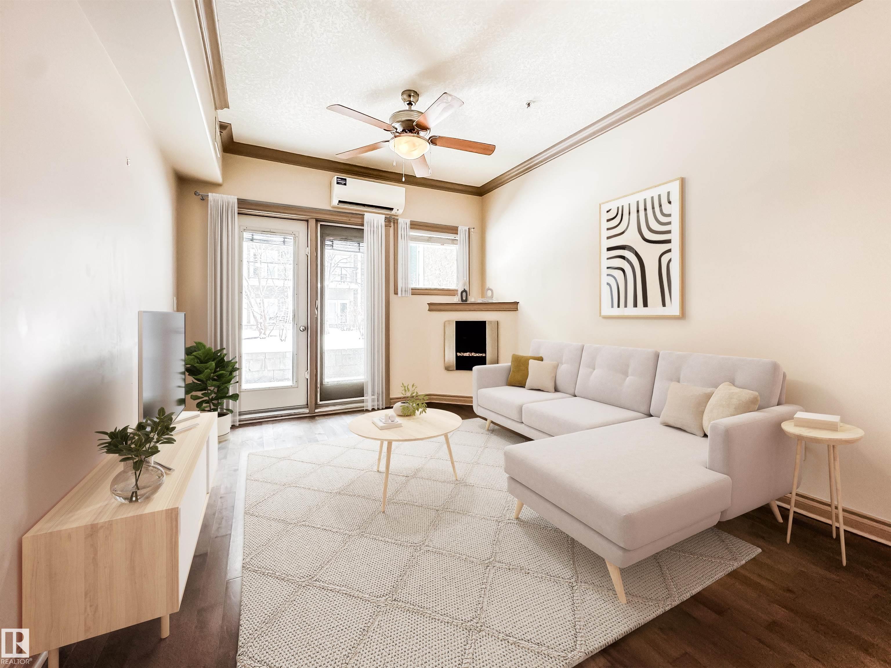 COURTYARD VIEWS & WALKABLE UNIVERSITY LOCATION! This bright and updated 2-bedroom, 2-bath condo offers the perfect blend of comfort and lifestyle. The open-concept layout features hardwood floors, an electric fireplace, and a spacious living and dining area that flows to your private patio overlooking the landscaped courtyard and fountain, a favourite spot in the summer. The kitchen offers stainless steel appliances, plenty of counter space, and updated flooring (2018). The primary bedroom includes a walk-in closet and full ensuite, while the second bedroom and bath work perfectly for guests, roommates, or a home office. In-suite laundry, excellent storage, and underground parking included. Updates: dishwasher (2023), heating coil (2022), and A/C coil (2025). Walk to the University of Alberta, Whyte Ave, the Strathcona Farmers? Market, and the 99 Street microbreweries. Welcome home!