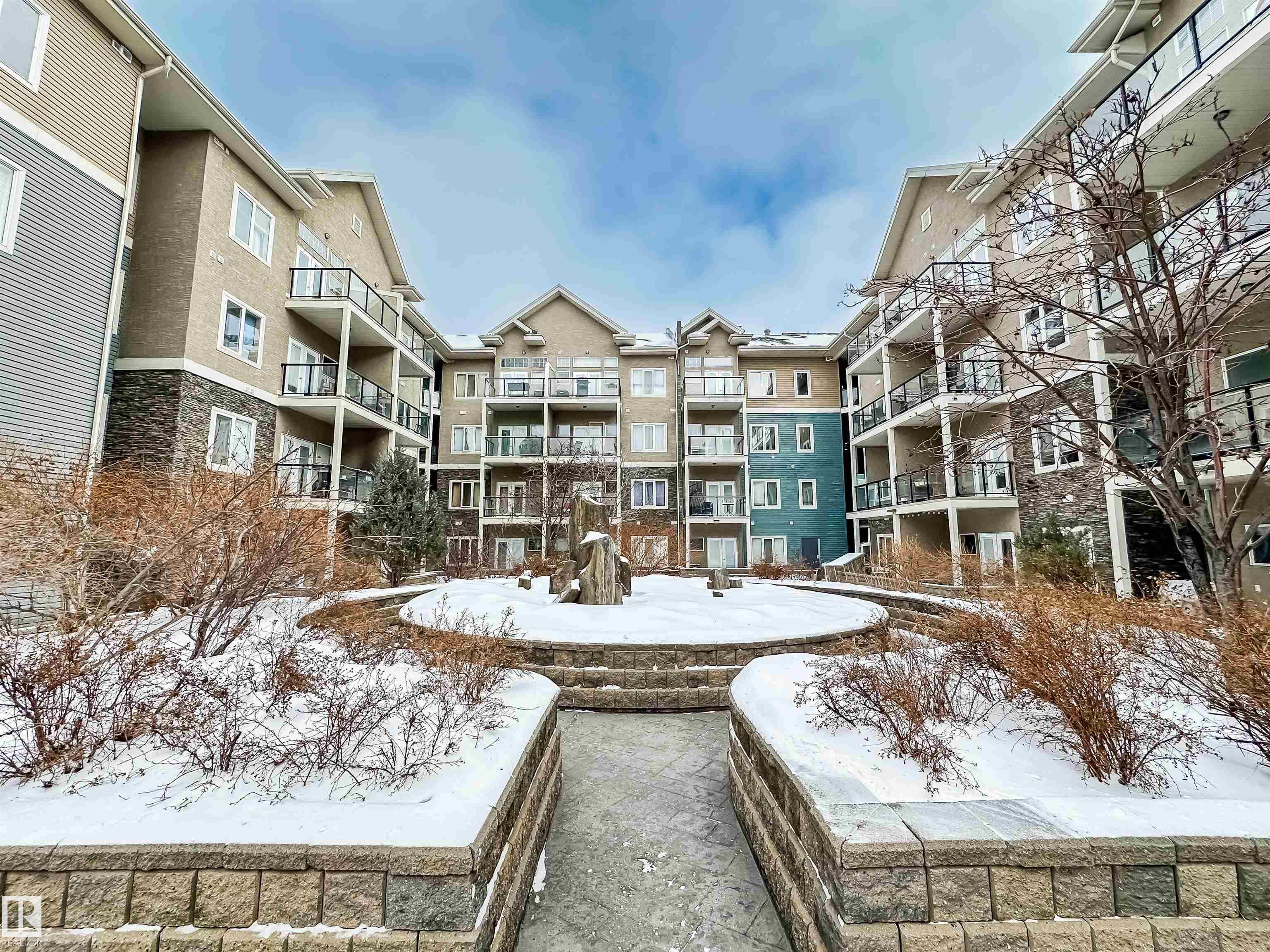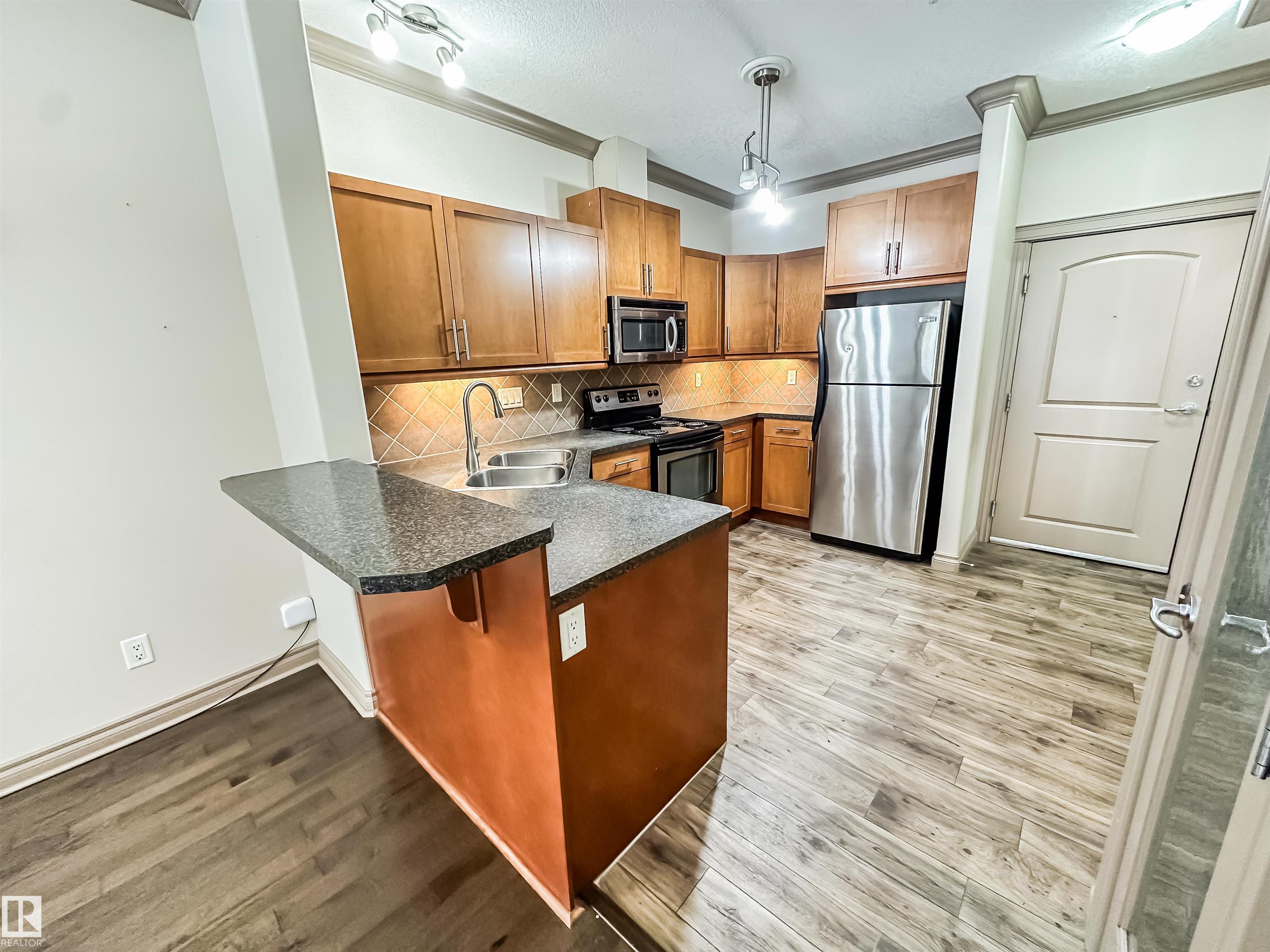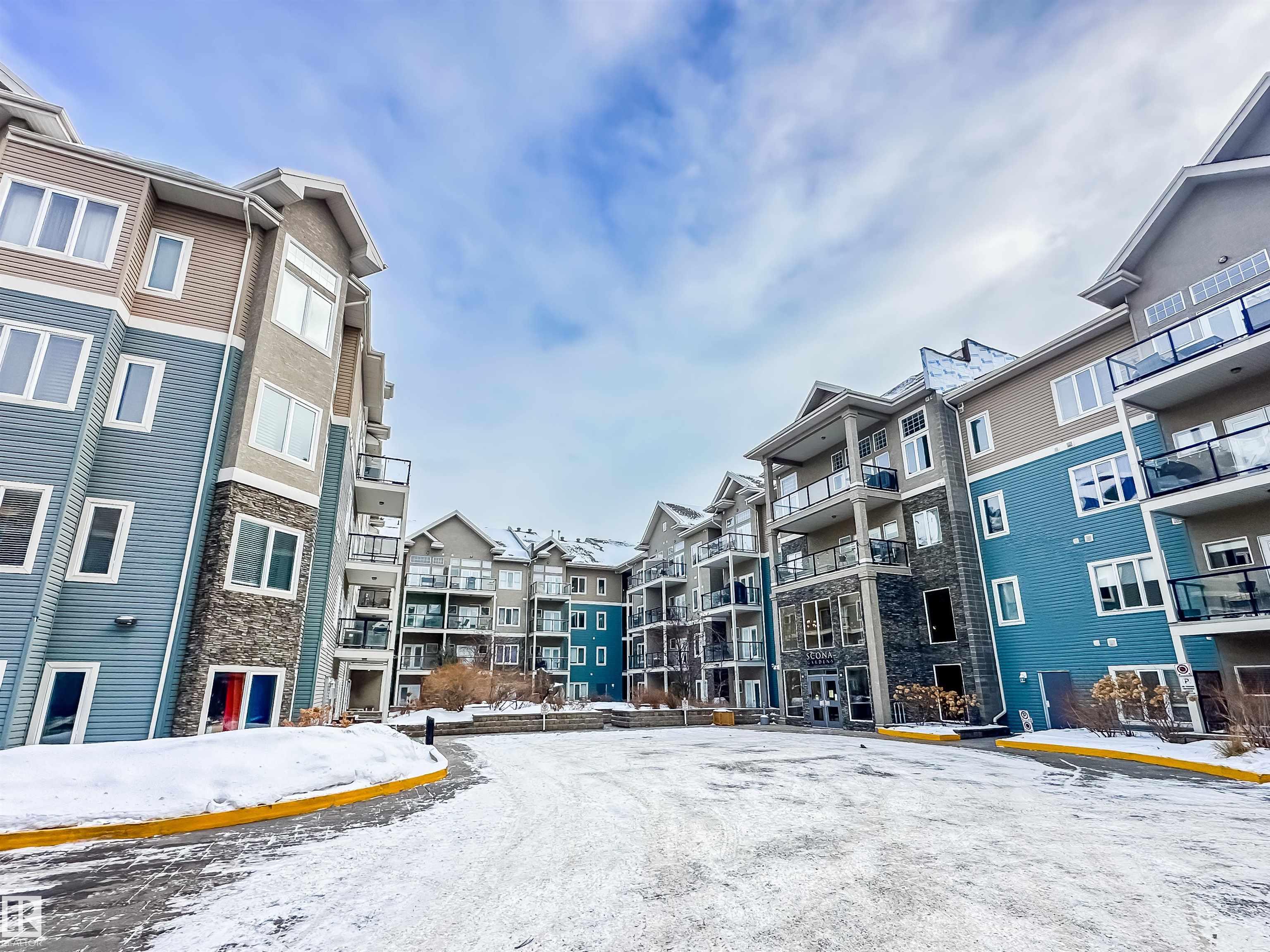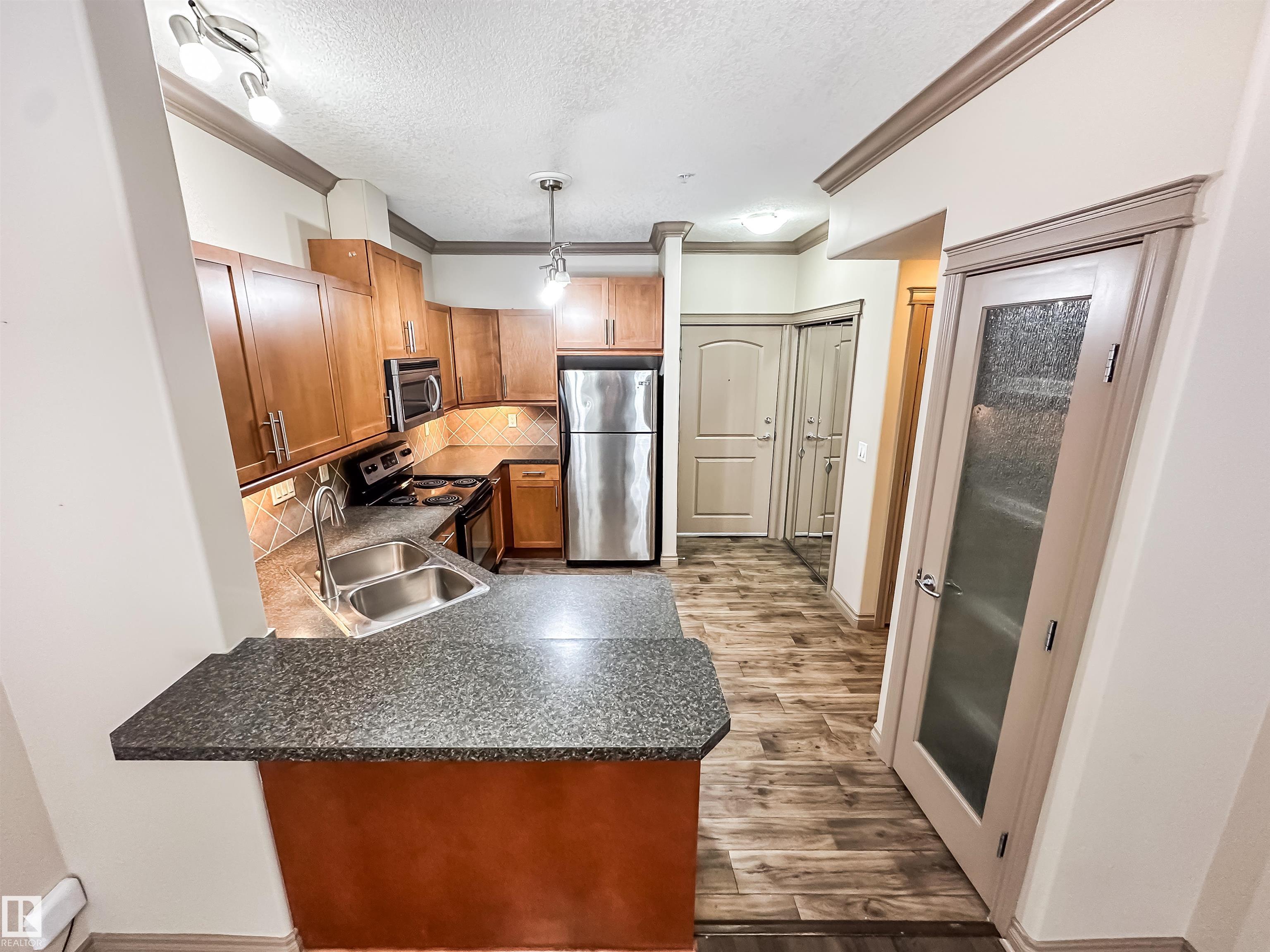 COURTYARD VIEWS & WALKABLE UNIVERSITY LOCATION! This bright and updated 2-bedroom, 2-bath condo offers the perfect blend of comfort and lifestyle. The open-concept layout features hardwood floors, an electric fireplace, and a spacious living and dining area that flows to your private patio overlooking the landscaped courtyard and fountain, a favourite spot in the summer. The kitchen offers stainless steel appliances, plenty of counter space, and updated flooring (2018). The primary bedroom includes a walk-in closet and full ensuite, while the second bedroom and bath work perfectly for guests, roommates, or a home office. In-suite laundry, excellent storage, and underground parking included. Updates: dishwasher (2023), heating coil (2022), and A/C coil (2025). Walk to the University of Alberta, Whyte Ave, the Strathcona Farmers? Market, and the 99 Street microbreweries. Welcome home!